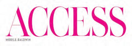 and art material will be considered, but will be recieved only with the understanding that the magazine or its employees shall not be responsible for loss or damage, unless otherwise agreed to in writing. All contents @Hayley Hill Style Access, LLC. All rights reserved. Reproduction in whole or part without permission is prohibited. ACCESS mobile.baldwin is published 10 times per year. Subscription rate is $21.95 per year. All subscription inquiries should be mailed to P.O. Box 8586, Mobile, AL 36689-8586 or visit AccessTheMagazine.com. If the post office alerts us that your magazine is undeliverable, we have no further obligation unless we receive a corrected address within two years.
