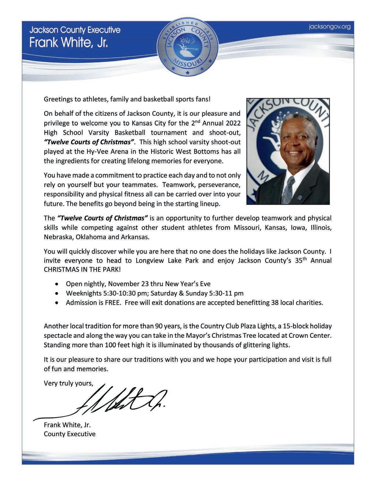 “The Twelve Courts of Christmas” 2022 Edition is expected to bring over 200 outstanding High School basketball teams to Hy-Vee Arena. The schools come from Missouri, Kansas, Iowa, Nebraska, Oklahoma, and for the first time...Arkansas. The event hosts schools of all sizes. There are schools from big cities and schools from small, rural communities. The participation of each of these schools, and everyone involved, is most appreciated. The excitement generated from “The Twelve Courts of Christmas” has already garnered commitments from many schools for the 2023 Edition, including three schools from the State of Illinois.