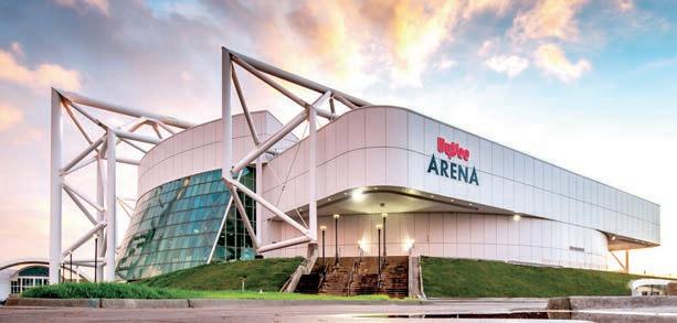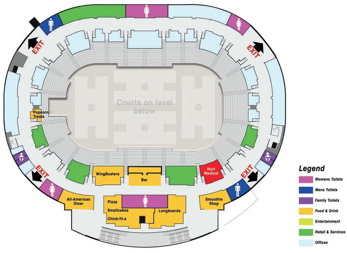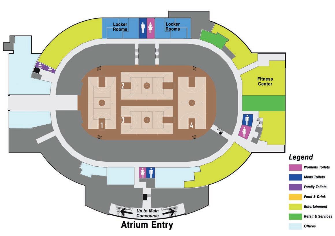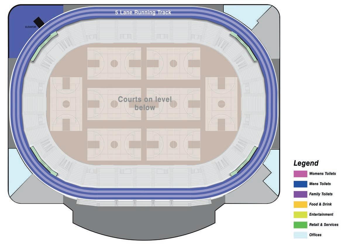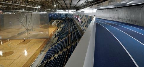 It is the Nation’s rst multi-level, multi-functional sports complex. e installation of a second oor created over 80,000 square feet of column-free space bringing a total of 12 basketball courts to the arena, one of a few buildings in the USA to have that many. e four lower-level courts are lined for NBA and Collegiate regulation. e eight upper-level courts are lined for High School and Col legiate regulation. With a ve-lane, 350m Mondo running track added to the top of the upper seating bowl and the concourses re thought to create space for o ces, entertainment, retail and dining, the building now tops out at over 355,000 square feet.