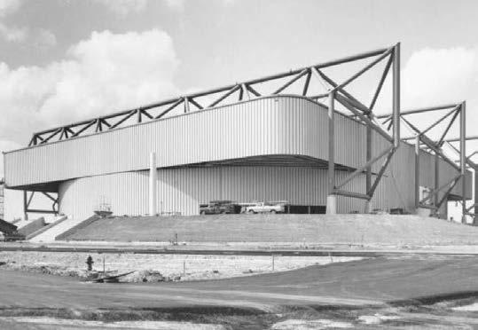 Although it is simple in design, it was considered rev olutionary for having no interior columns obstruct ing spectator views. e roof is suspended by exterior steel trusses. However, torrential rainstorm in June 1979 proved to be a challenge. e roof was designed to gradually release water so it wouldn’t overrun the sewer system, but it couldn’t divert the massive amounts of water fast enough. e ceiling collapsed. Luckily no one was in the building and there were no casualties. e roof was redesigned to avoid any such damage in the future.