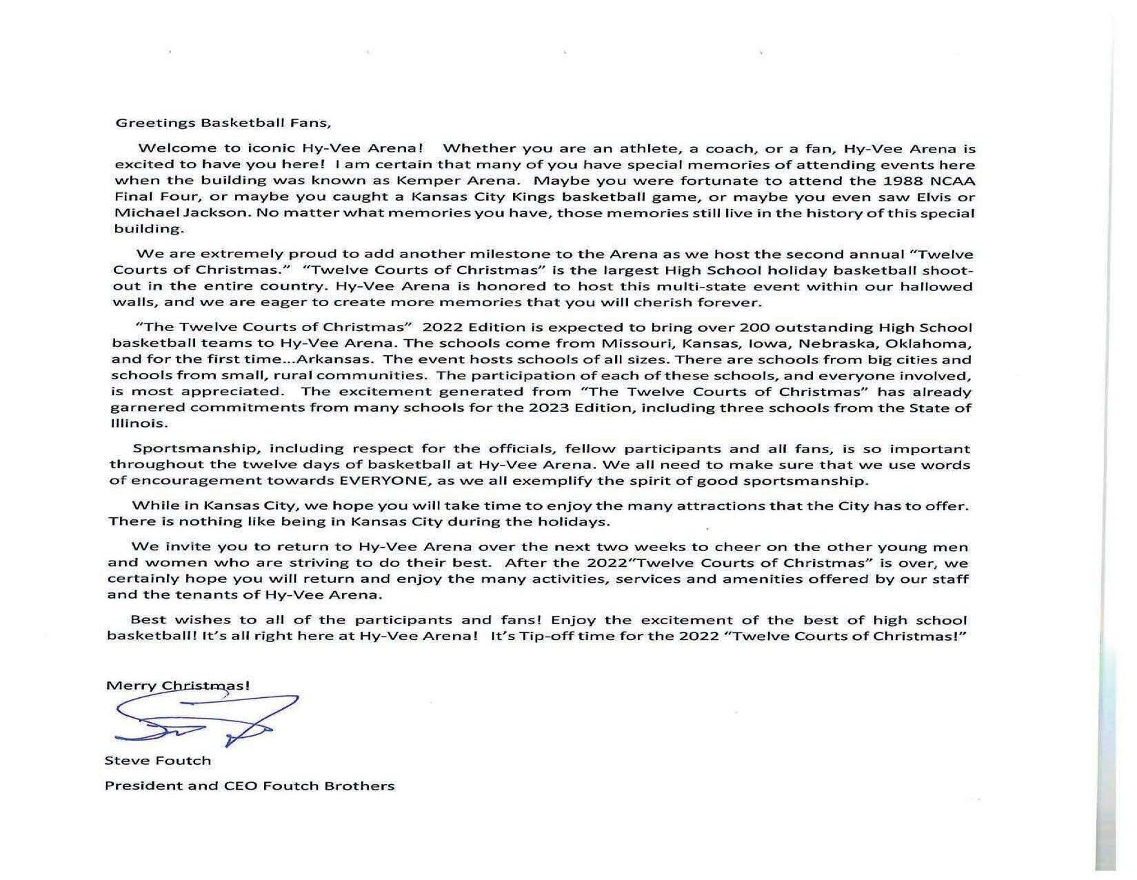 Best wishes to all of the participants and fans! Enjoy the excitement of the best of high school basketball! It’s all right here at Hy-Vee Arena! It’s Tip-off time for the 2022 “Twelve Courts of Christmas!”