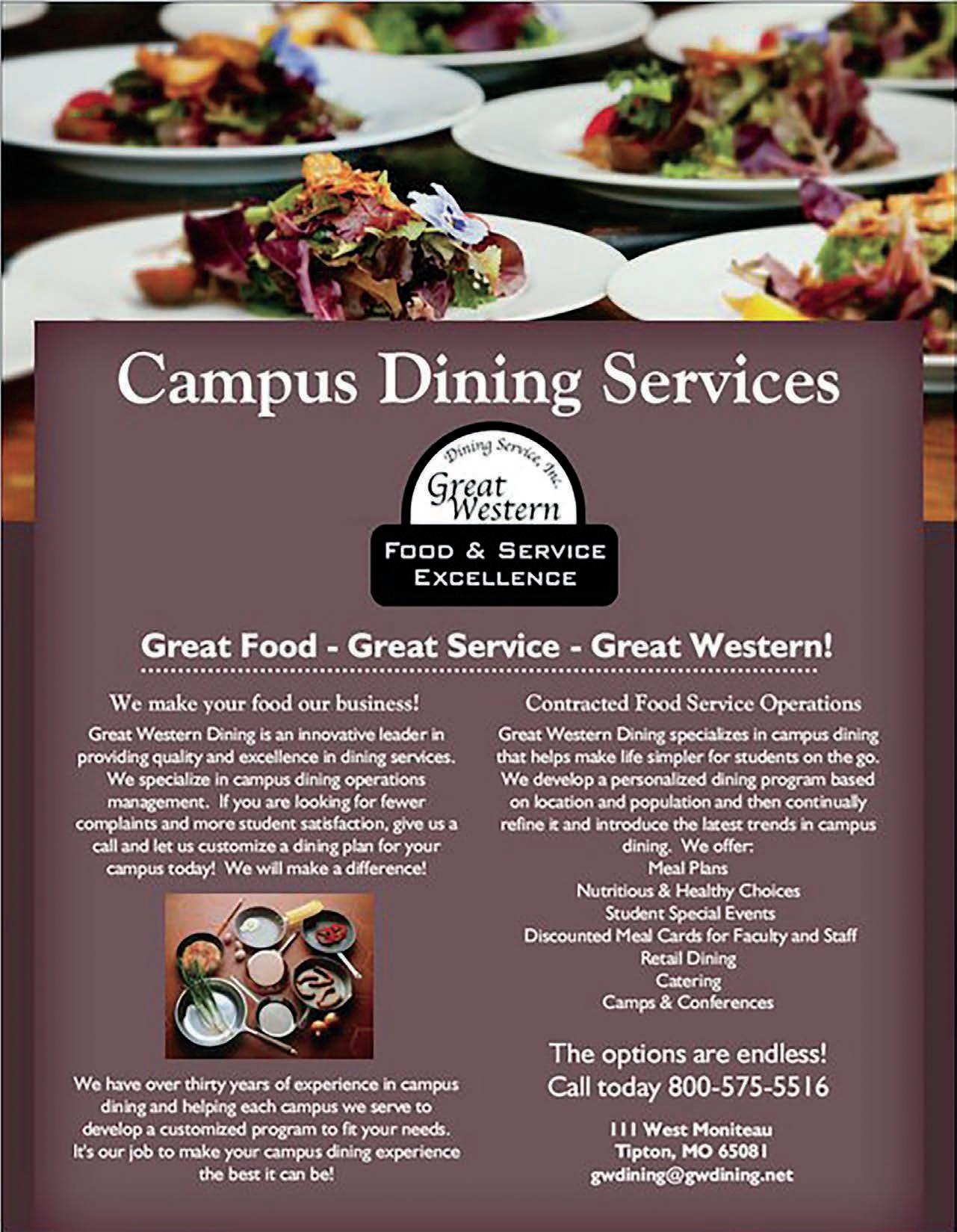 reat estern ining specializes in campus dining that helps ma e li e simpler or students on the go. e develop a personalized dining program ased on location and population and then continually refine it and introduce the latest trends in campus dining. e o er