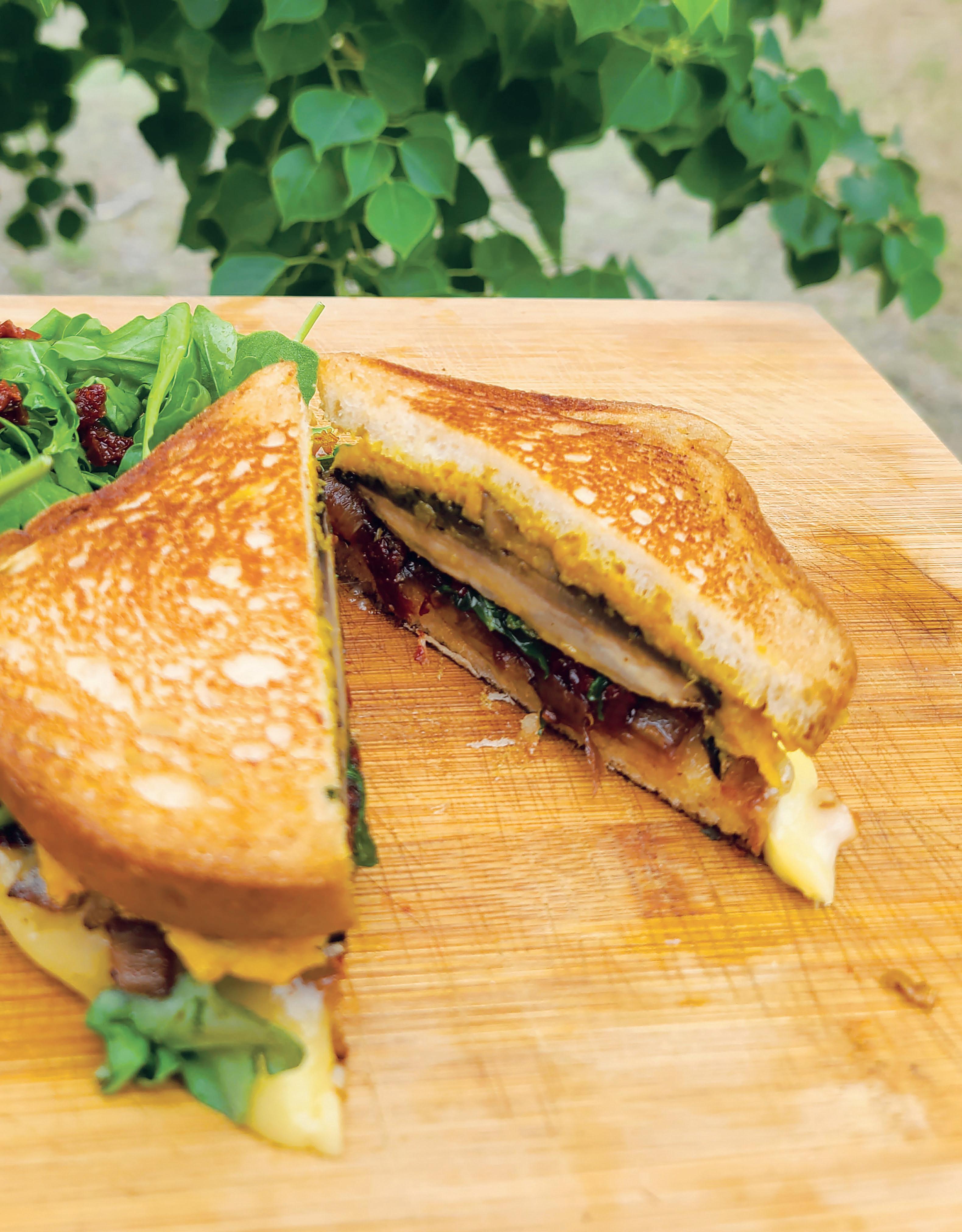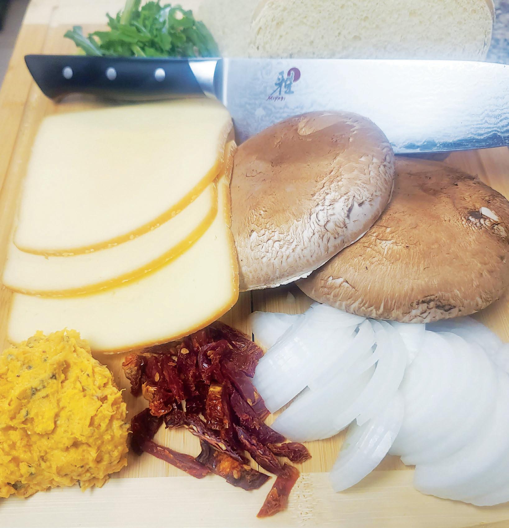 3: Time to assemble! On your toasted sourdough, spread the butter nut spread on one side, followed by the mushroom, onions, tomatoes, and arugula. I like to put the cheese on top just to kind of melt everything together. And there you have it! All these great fall flavors with a nice fresh harvest spin.