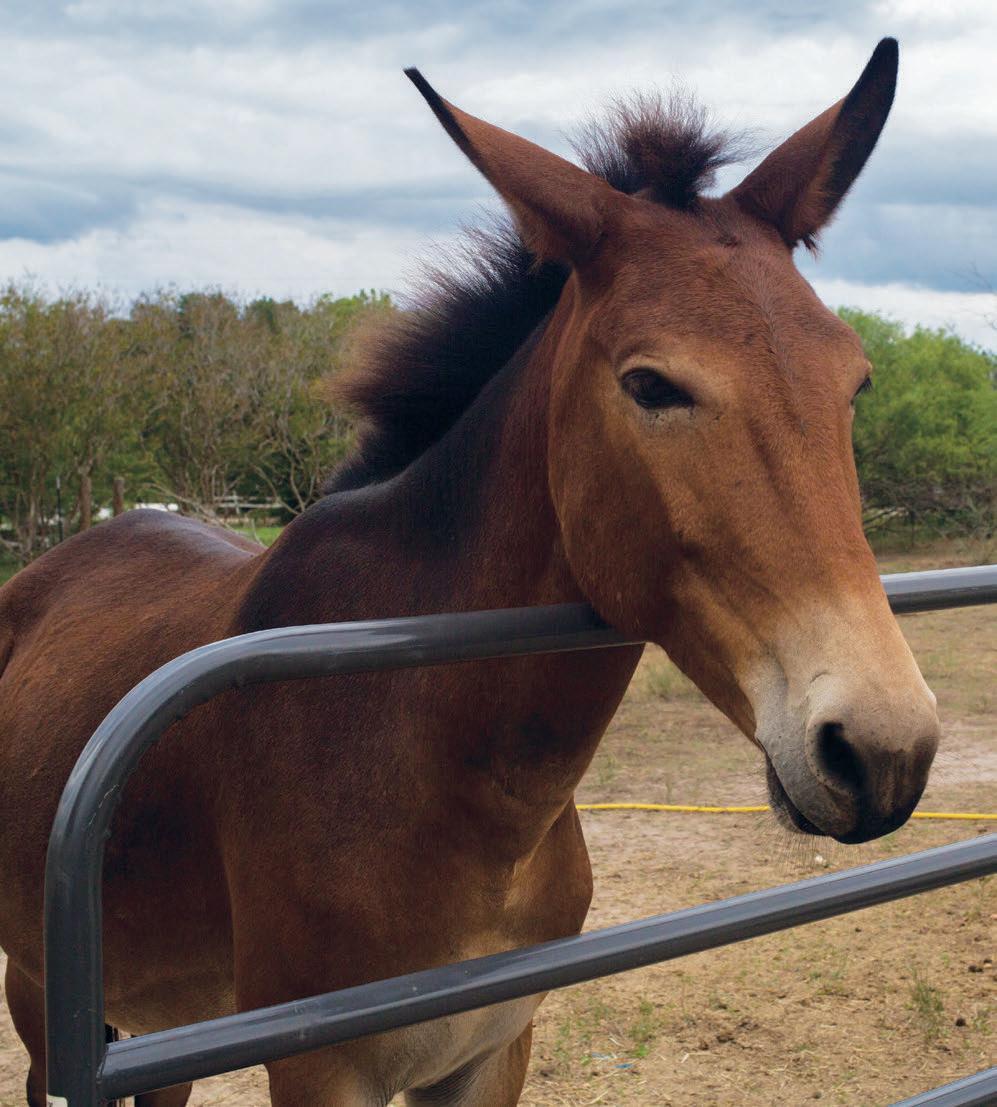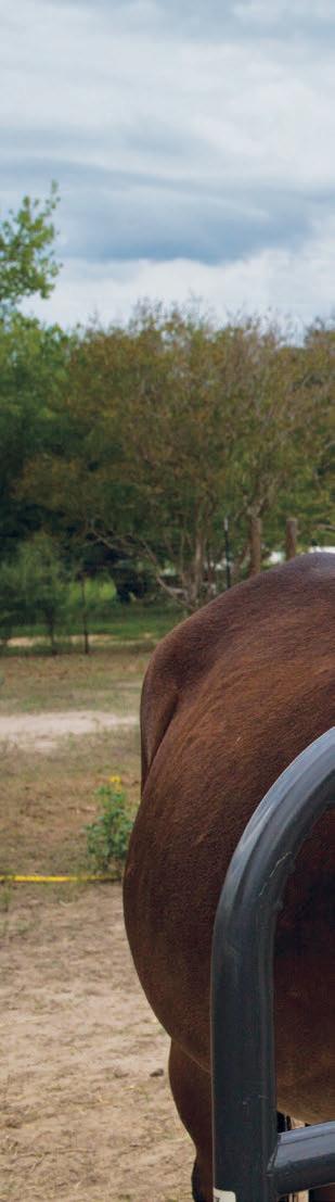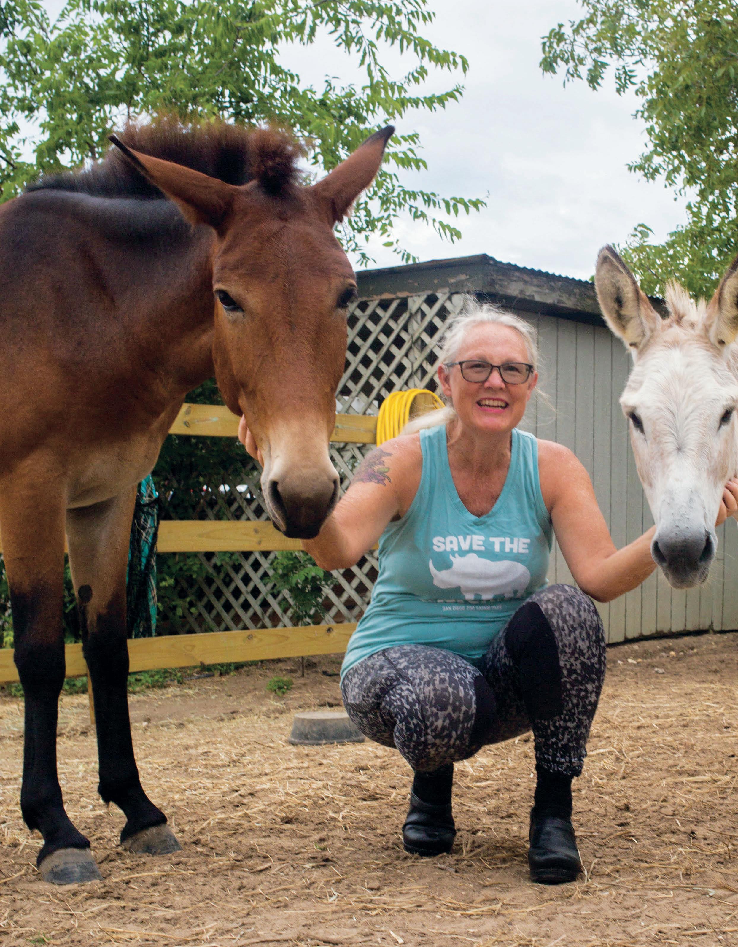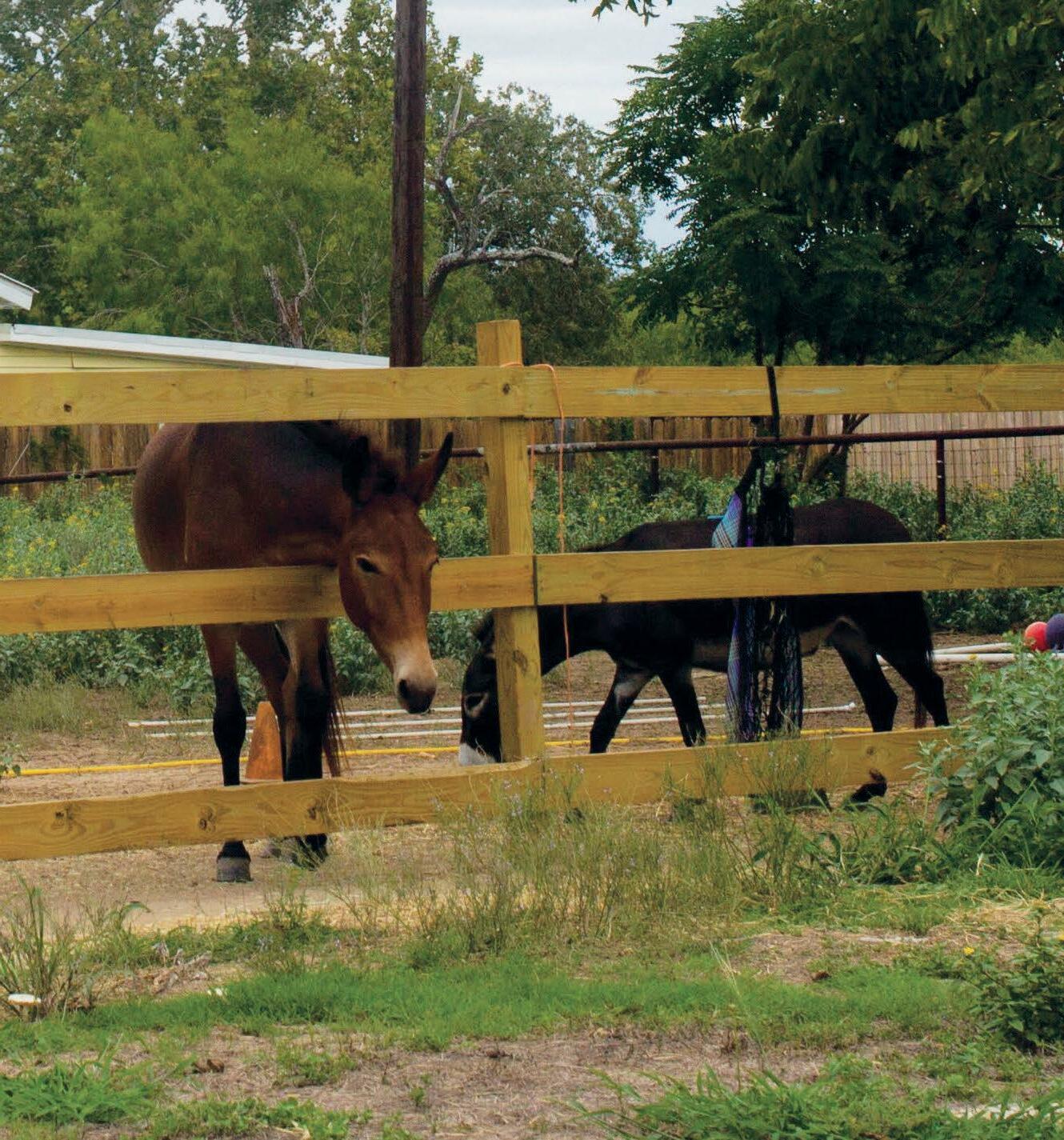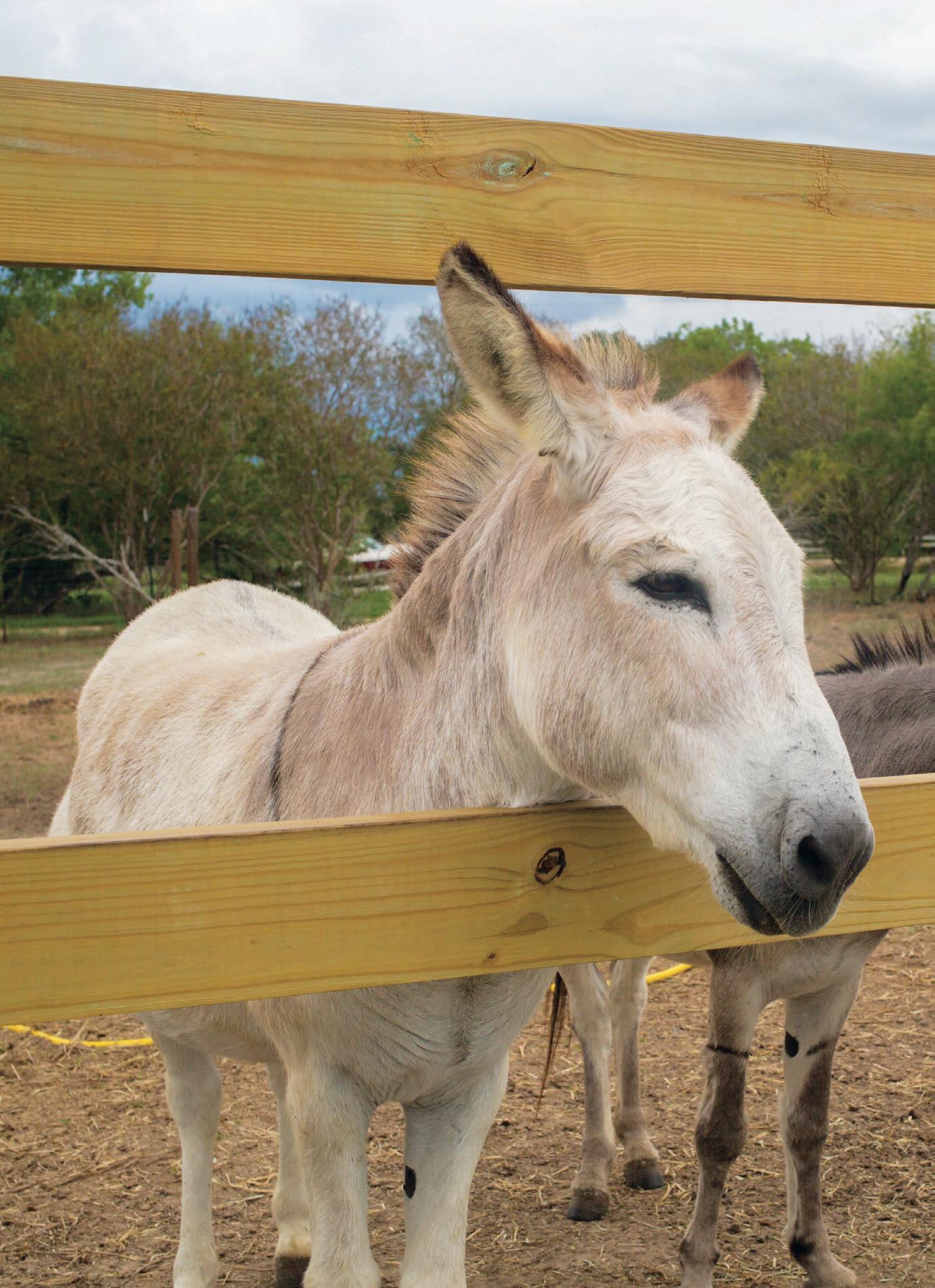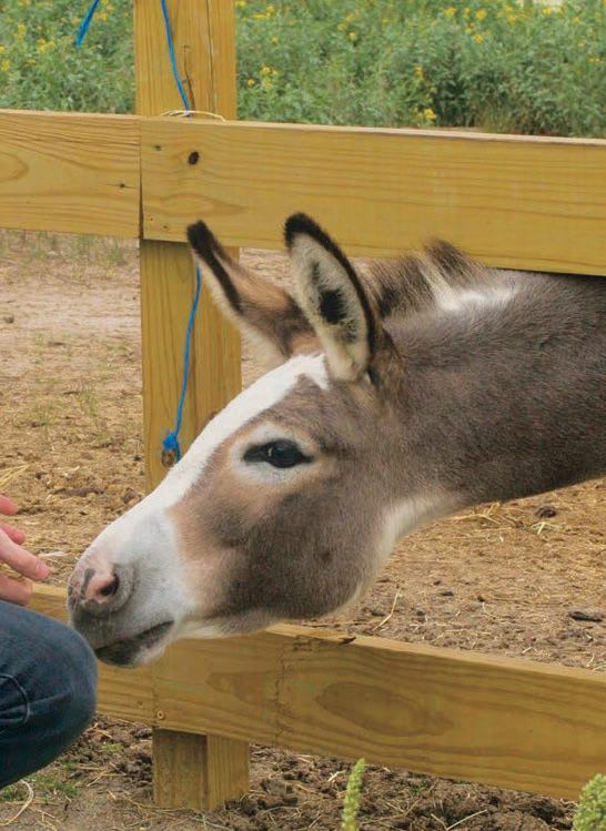 Downa long country road, at the end of a gravel drive in Kings bury you’ll find Cheshire’s Legacy Sanctuary and owner Robin Bisha, a professor at Texas Lutheran Univer sity. Anyone who arrives immediately is greeted by some of Bisha’s equine friends.