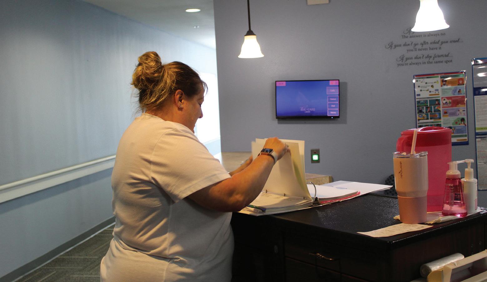 Michelle Stransky, a nurse at Trinity Shores, checks paperwork before attending to a resident.