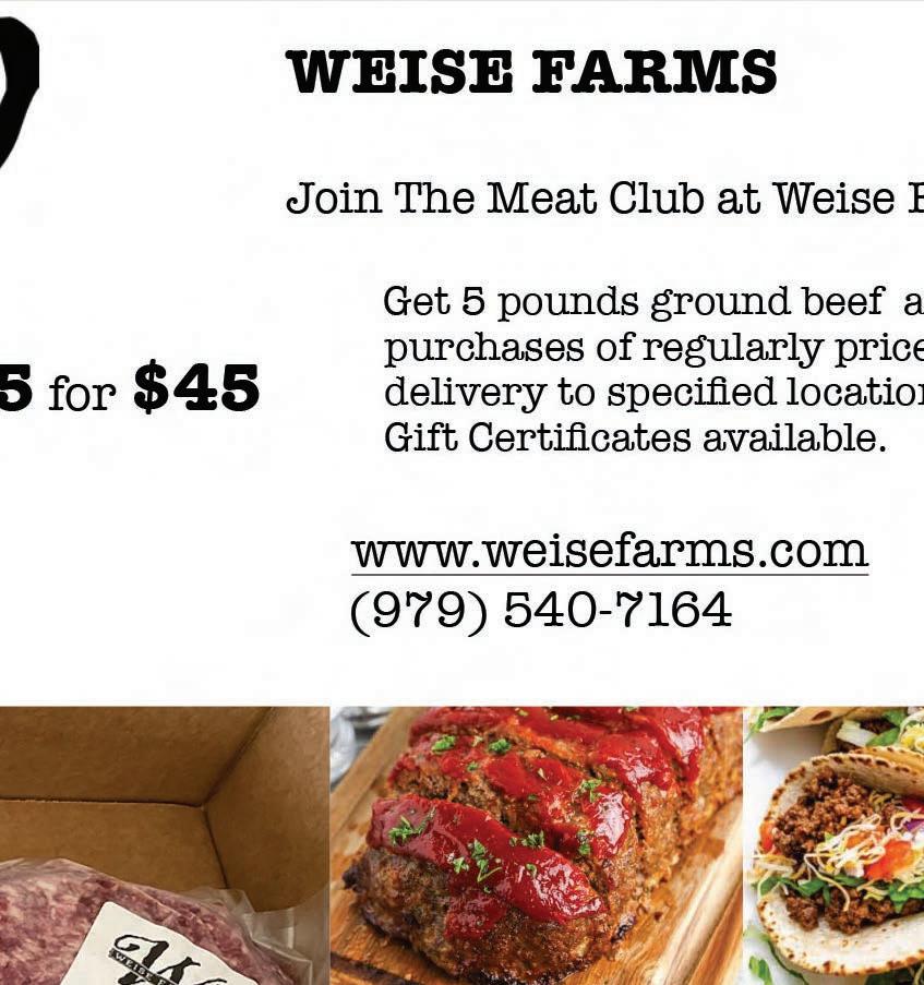 Weise Farms is bringing back “The Meat Club.” This modern day meat club subscription is just $45 per month, and you get five pounds of ground beef each month, with a same-day discount on any regular priced meats that are in stock at Weise Farms, and free delivery or pick-up at set locations in La Grange and Giddings. You will also receive first-inline priority on other products as they become available. Your monthly meat club subscription brings predictability to your menu, while helping to keep our local farm sustainable. That’s a win-win for all of us!