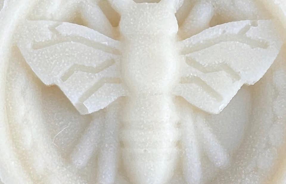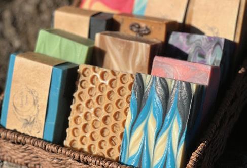 This is where her creativity really gets to shine. “I love getting a scent, and smelling it, and going, what colors do I see? What design do I see?” McLarty shares. She uses a variety of tools to create textures and designs in the soap. The possibilities are limited only by her imagination. One freshscented bar was inspired by the blue water at a barber shop. Bubble wrap pressed into the top makes a honeycomb design, different colors in the soap swirled with chopsticks create a feather effect, and a spoon repeatedly dipped into the cooling soap creates a wavelike pattern.