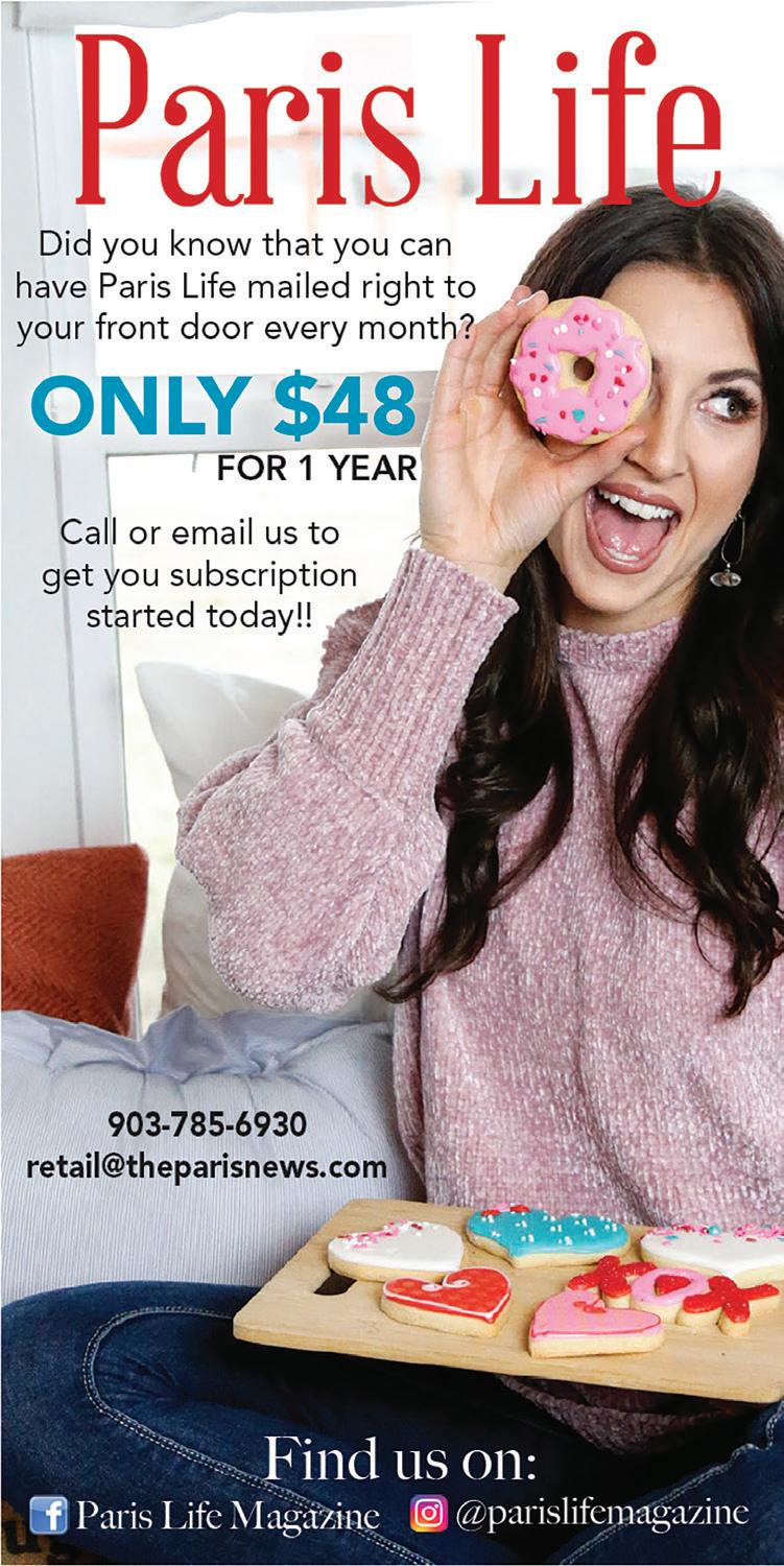 4 Paris Life PUBLISHER CLAY CARSNER EDITOR DESIGN/COMPOSITION MEGAN PEDERSEN CRISELDA GARCIA ADVERTISING CLAY CARSNER DERRICK THOMAS Paris Life STAFF theparisnews.com #parislifemagazine #myparistexaslife #myparistxlife