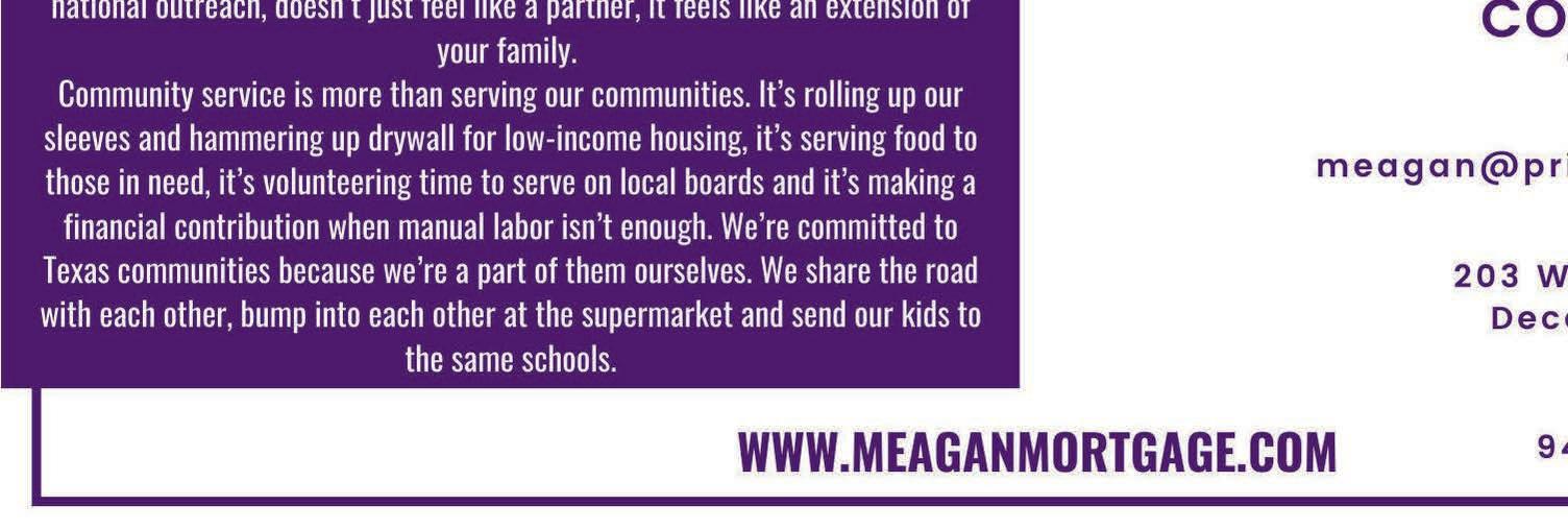 Advertisers 111 Beef Republic ............................................................................12 1860 Pizza Co ........................................................................................15 Ary Co ...............................................................................................................17 Ballard Dental ..........................................................................................15 BPW Law ..........................................................................................................7 Bridgeport Animal Hospital.....................................................28 Bridgeport EDC ....................................................................................51 Bridgeport Eye Center .................................................................30 Bridgeport Main Street................................................................19 Brown’s Barber Shop .....................................................................34 CASA ..................................................................................................................22 City of Bridgeport...............................................................................27 City of Bridgeport Parks and Recreation ...............11 DATCU .................................................................................................................5 Decatur Heat and Air .....................................................................32 Dos Chiles ........................................................................................................2 Family Clinic................................................................................................13 First Financial Bank ...............................................................................9 First National Bank ............................................................................21 First National Bank, Mortgage ..................Back Cover Foundation Therapy.........................................................................18 Guardian Title Company ................................................................9 iOffice .................................................................................................................13 James Wood Motors .....................................................................25 Mann Refrigeration ...........................................................................15 Marker Cellars Winery ..................................................................24 Martin Marietta ......................................................................................11 Más Meat.......................................................................................................31 PrimeWest Mortgage ....................................................................24 Scooter’s Coffee ...................................................................................19 Skin & Body Works Spa...............................................................49 Stagecoach Rehabilitation ........................................................14 The Community Bank ...................................................................11 The Father’s House ..............................................................................5 United Way .....................................................................................................9 Upper Trinity ..............................................................................................13 Weatherford College .....................................................................23 Wise County Messenger ...........................................................29 Wise County Title Company.....................................................4 Wise Health Clinics ...........................................................................17 Wise Health Foundation – Mary’s Gift ....................24 1602 Halsell Street • Bridgeport, TX 76426 940-683-3581 Get to know us more at www.wisetitle.com The “WISE” Choice for Your Title, Escrow & Closing Needs 100% LOCALLY OWNED Ken R. Dodson, Vicki C. Niblett, H. Berry White IV SERVING WISE COUNTY SINCE 1878 BY THE READERS OF THE WISE COUNTY MESSENGER BEST TITLE COMPANY IN WISE COUNTY Reader’s Choice Wise County Messenger 2022 Celebrating 145 Years of Continuous Service to Wise County Established 1878
