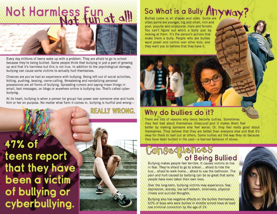 Explores the negative consequences of bullying. It includes information on: What is bullying? What kinds of people bully? Why do kids bully? What you can do to stop bullying and what you should not do. Finishes with a pledge to help stop bullying and respect everyone.