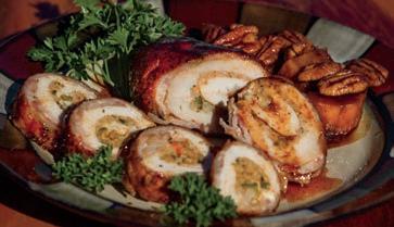 Ca un Stuffe il ur ey reast irections e o e ro brine and as . tter y breast o t and tenderize with meat mallet. Brush outside with c arified b tter and season. i o er and re eat. Spread thin layer of boudin across turkey and at the top make a line of cheese and peppers or olives to taste. Roll up the breast and cut into smaller pieces to wrap completely in bacon. Season bacon exterior with the Juicy Pig bbq rub and cook on an offset grill until an internal temperature of 160 then remove and glaze with salted vodka and grapefruit BBQ glaze. Rest 8 minutes before slicing.