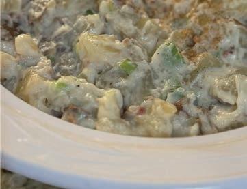 After the potatoes are boiled and have cooled somewhat, cut them into bite-size pieces in a large bowl. (I like to keep the peels on.) Add the chopped onions and about 1/3 cup of bacon bits. Add enough Ranch dressing to cover all veggies. Sprinkle on about 3 tablespoons of red wine vinegar or more, if desired. Add mayonnaise to blend all together. Add pepper and mix well. Cayenne pepper can be added for an extra “kick”, but not too much. Enjoy! bits,