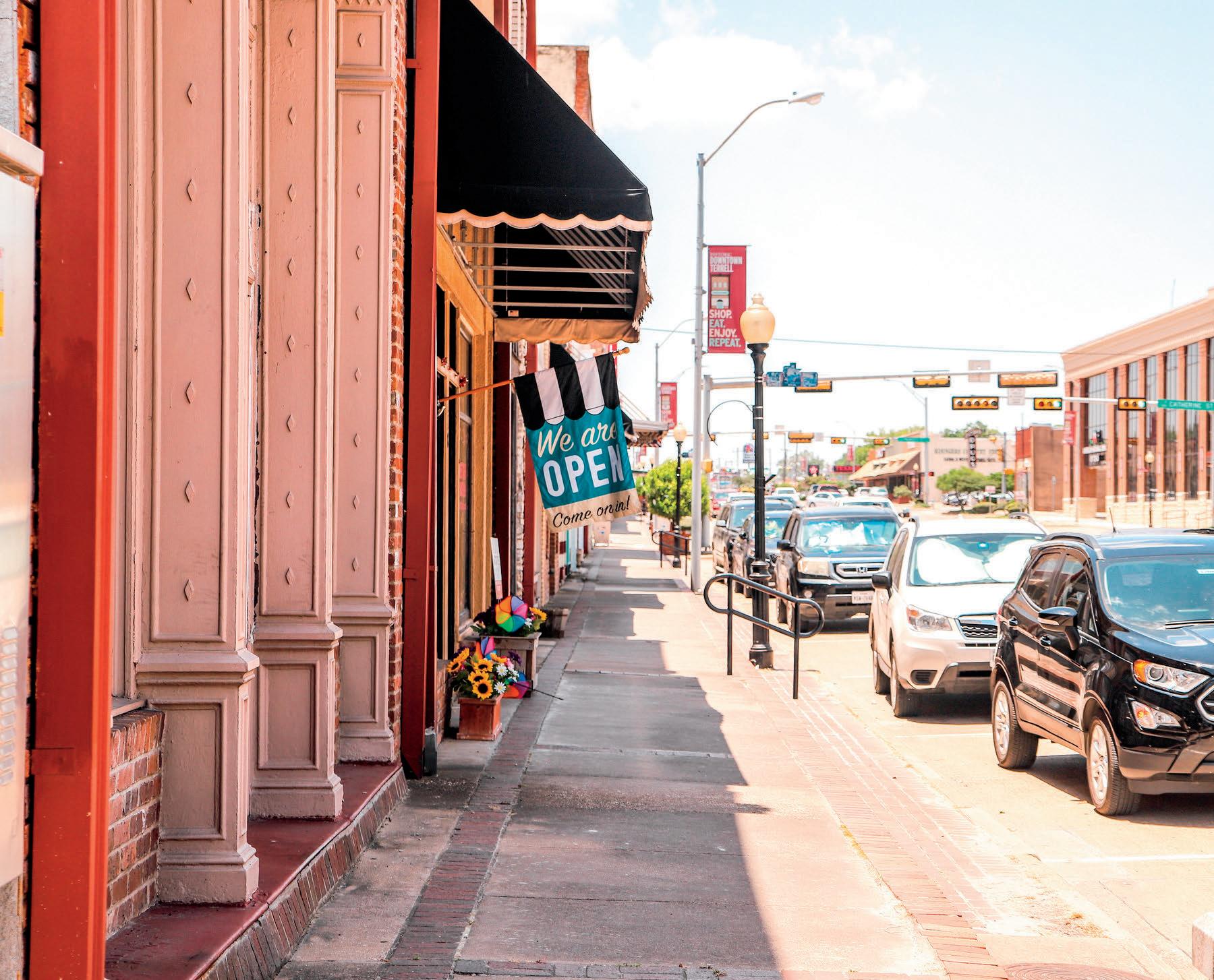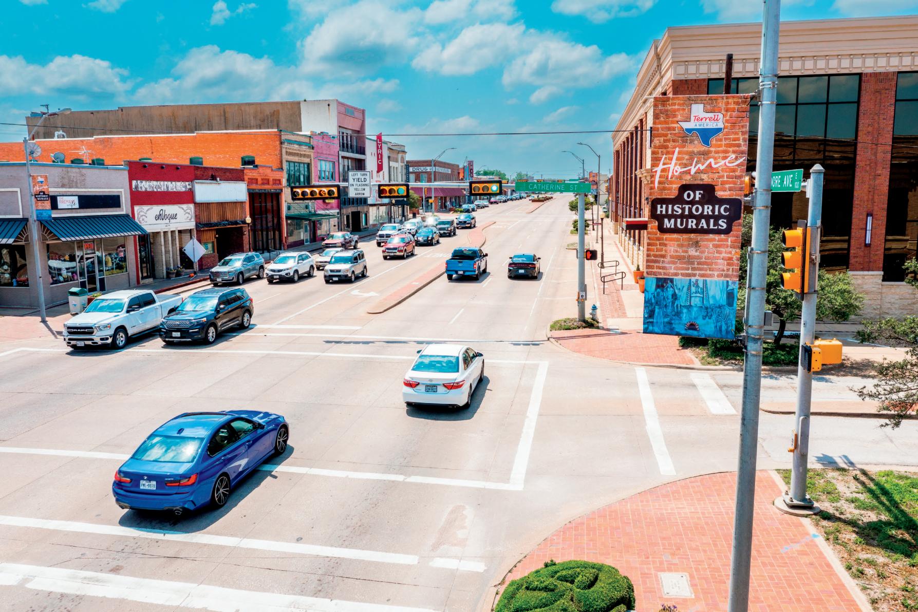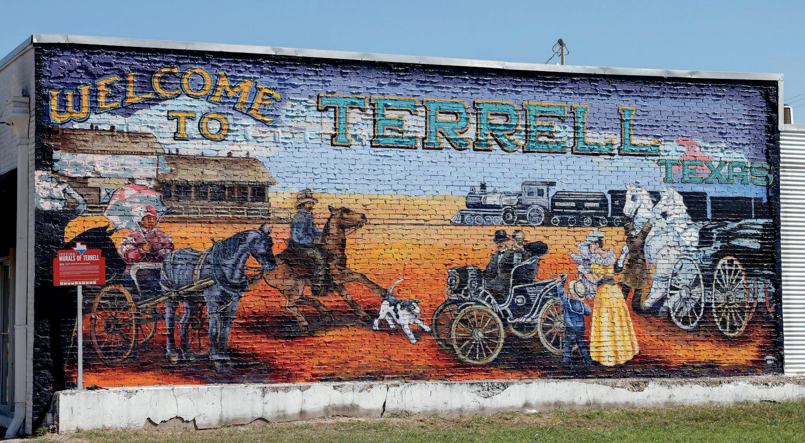 books to upscale consignment boutiques. You can even catch a vintage movie while sitting in the original theater seats. The district also features a series of hand-painted murals that capture Terrell’s rich history—depicting scenes like classic movie posters, a vintage biplane, an antique 1899 automobile, historic fi re engines, the Texas fl ag, and a nostalgic circus arrival.