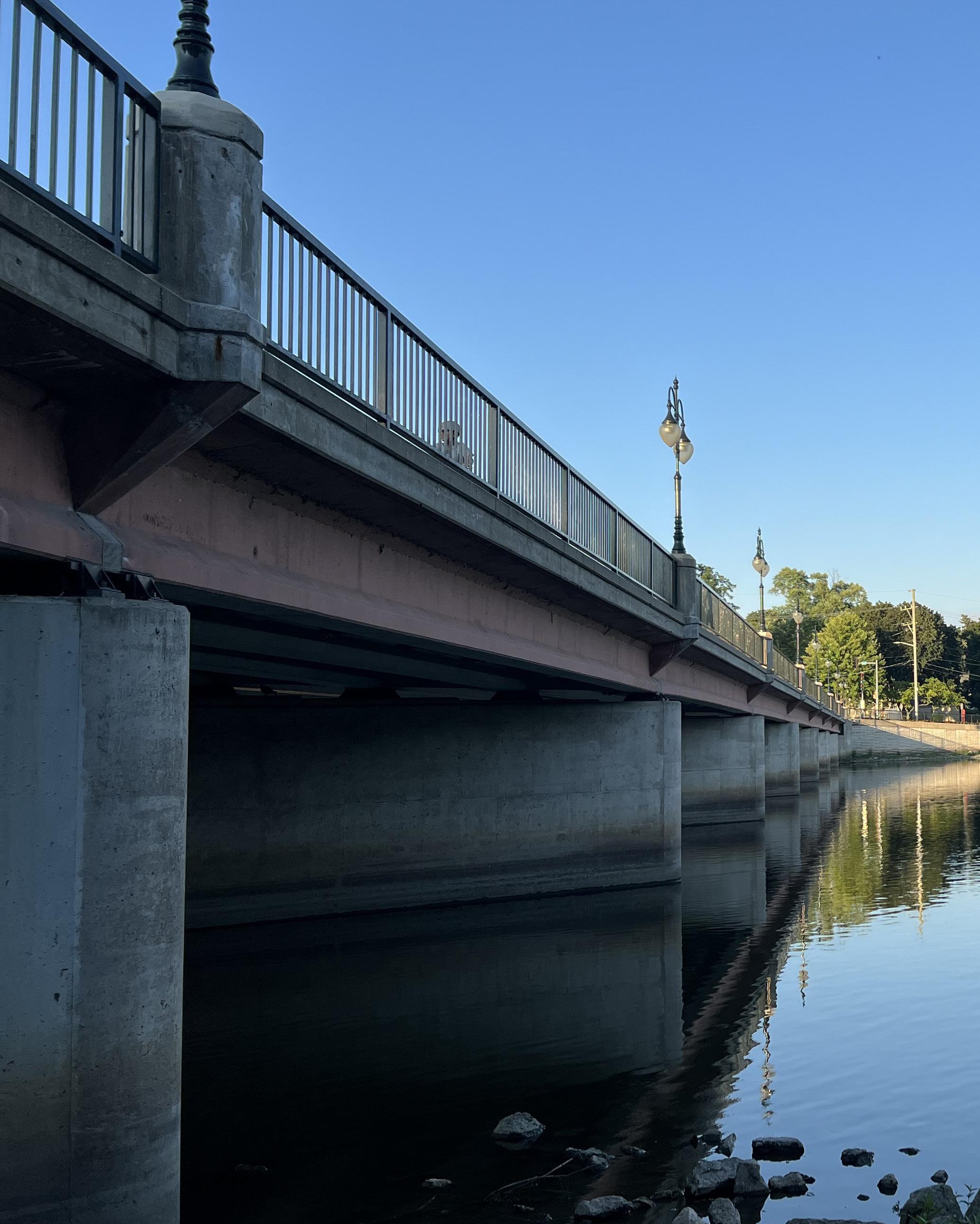 Serene evening view at Island Park in Geneva, capturing the Fox River Trail, as it gently curves beneath the Route 38 bridge, and the Fox River glistens under the early evening sky.