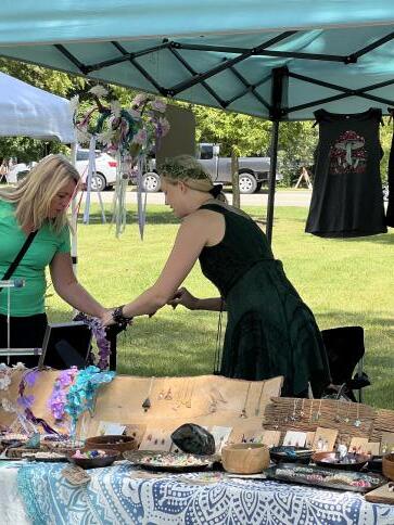“Fitting joy: Kelsey Rankin of Hemp Club Jewelry helps a customer slip on her new bracelets at the Folk Music Festival.”