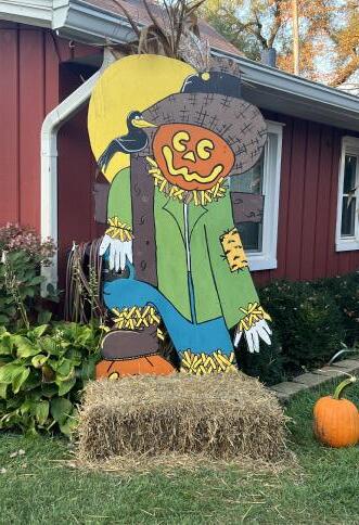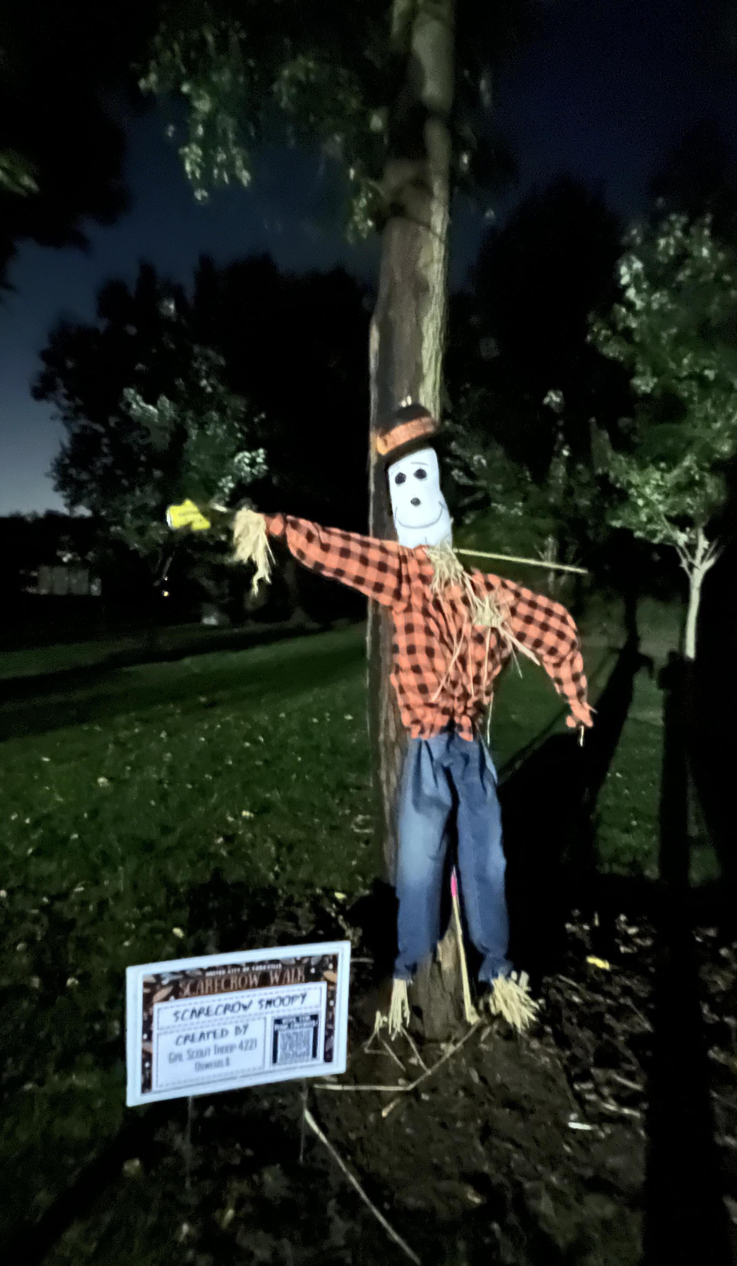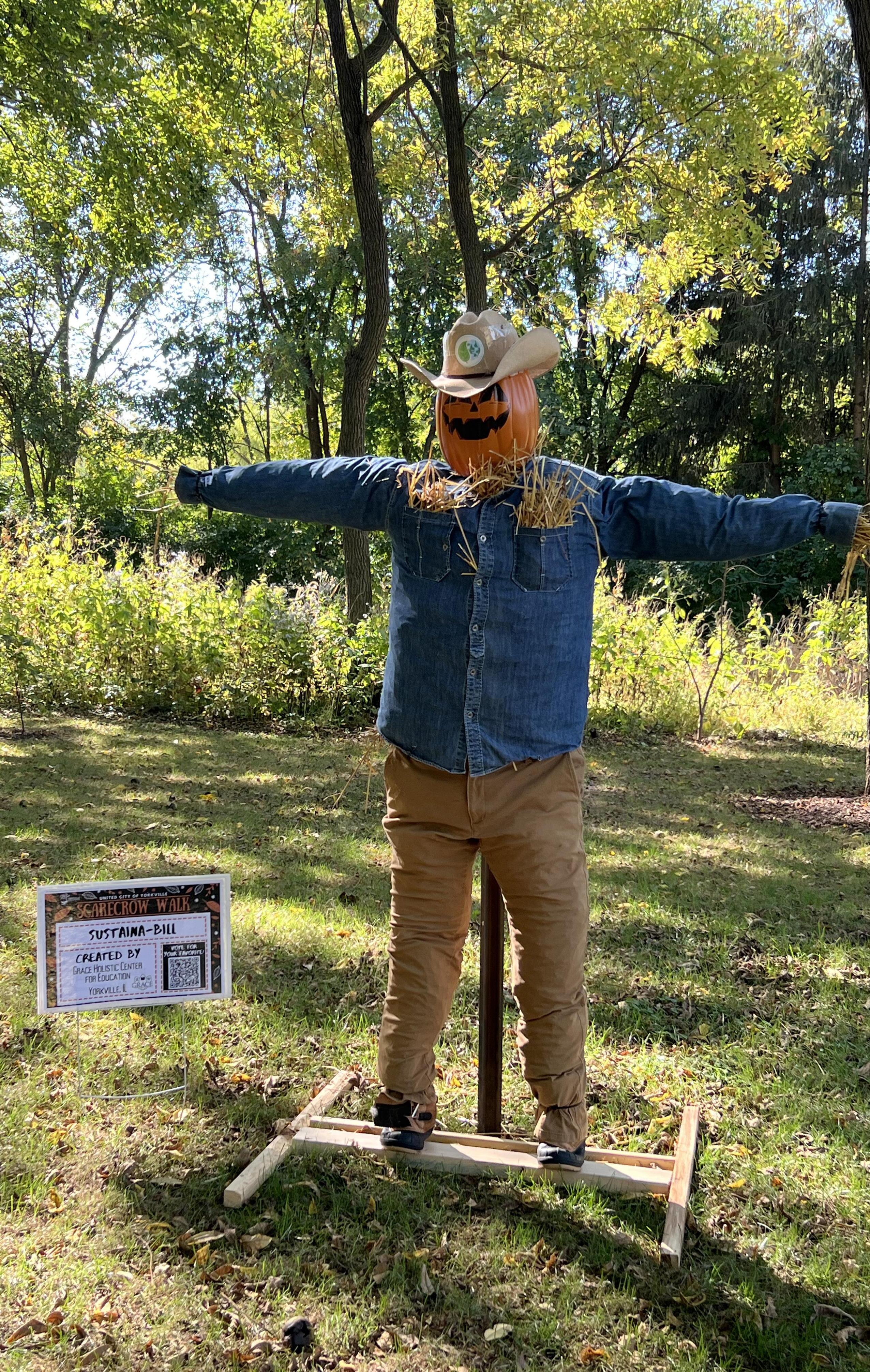 A jack-o’-lantern in denim and a cowboy hat stands guard along the trail, part of Yorkville’s Scarecrow Walk where neighbors turn straw and imagination into fall magic.