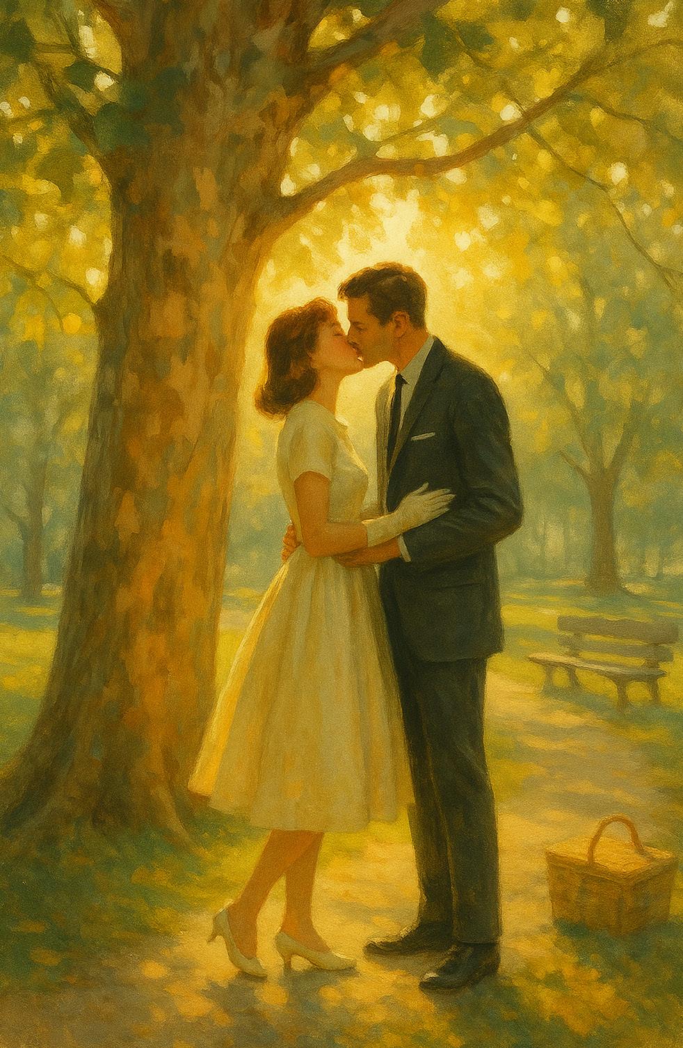 “Couple kissing under a sun-drenched sycamore tree in a park, beaming post-nuptial bliss and glow.”