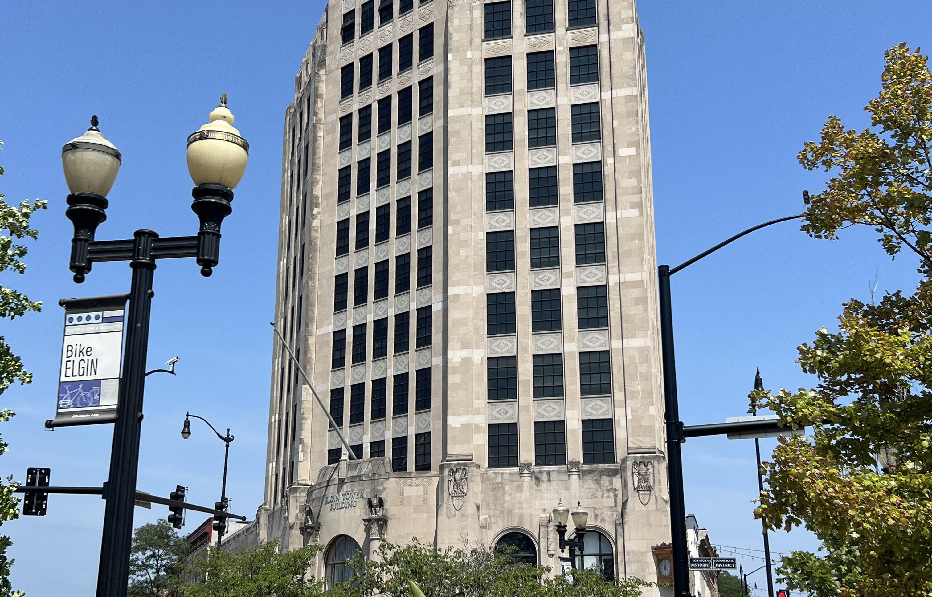 “Elgin’s Art Deco landmark: the Tower Building watching over downtown on a blue-sky afternoon.”