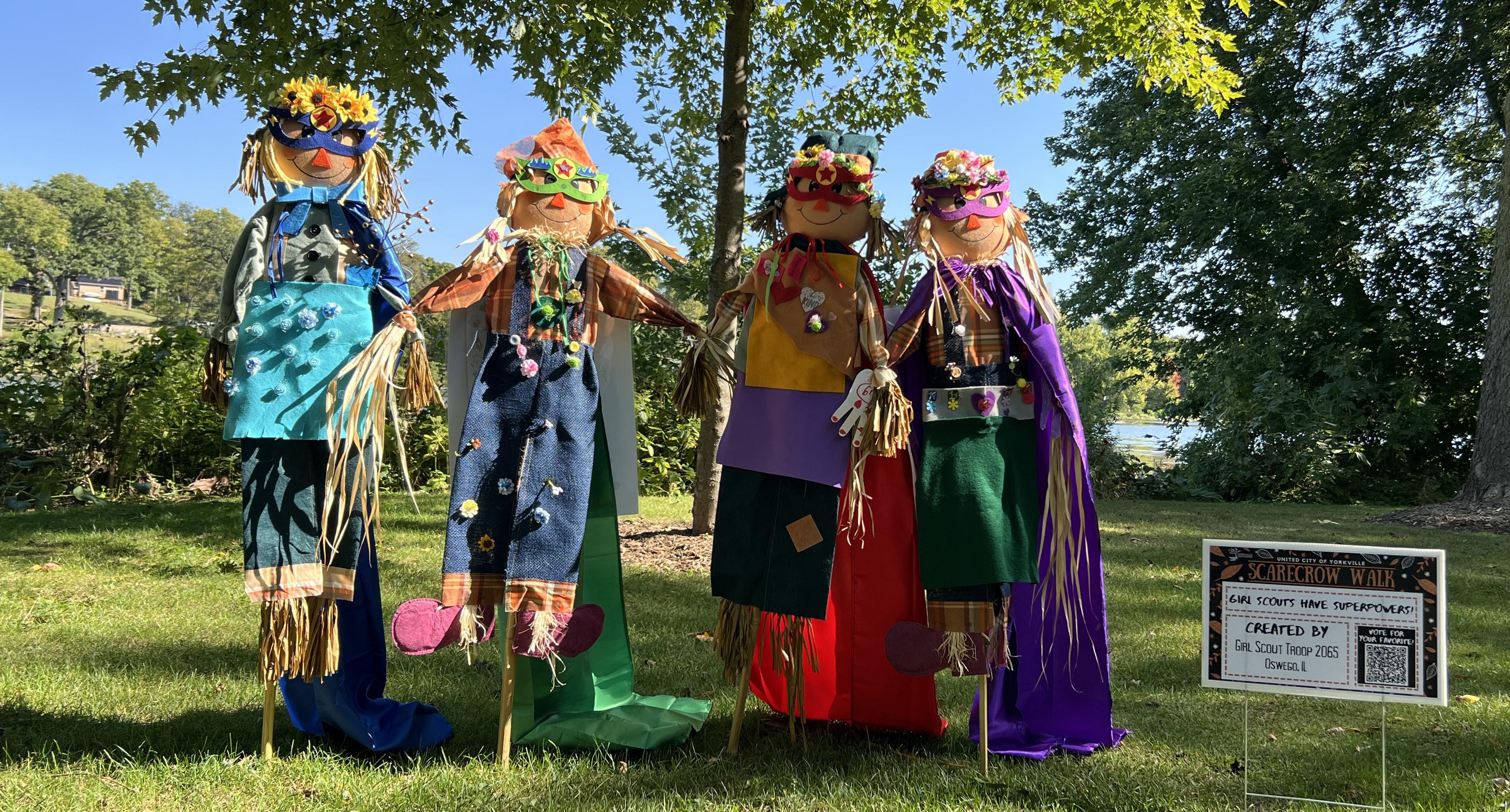 “Girl Scouts Have Superpowers”—a caped quartet brightens Yorkville’s Scarecrow Walk, stitched with color, creativity, and community pride.”