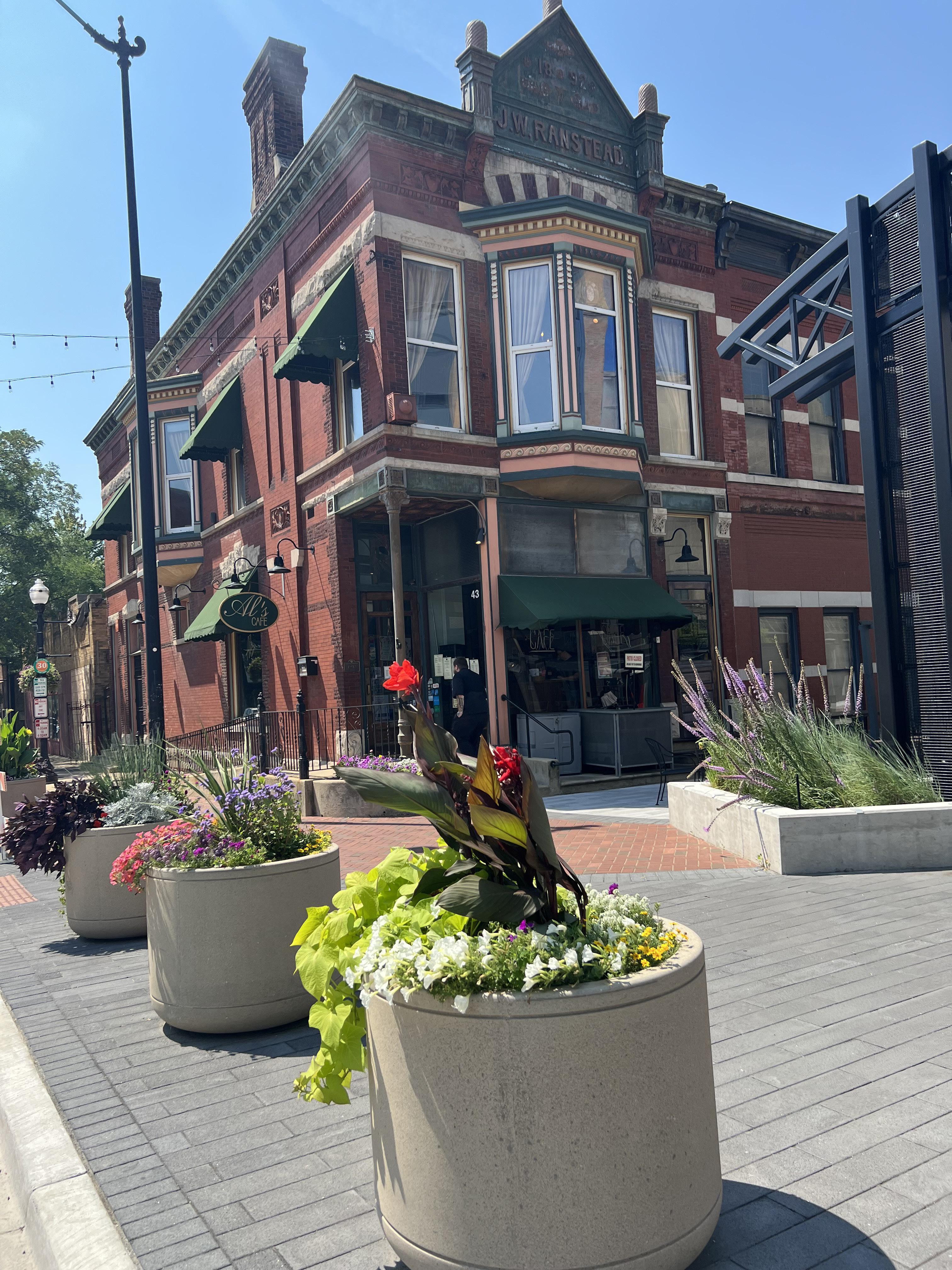 Image above: Globe sculpture along Elgin’s Riverwalk: a sunlit reminder of our place in a wider world beside the Fox. Image below: Historic Building.