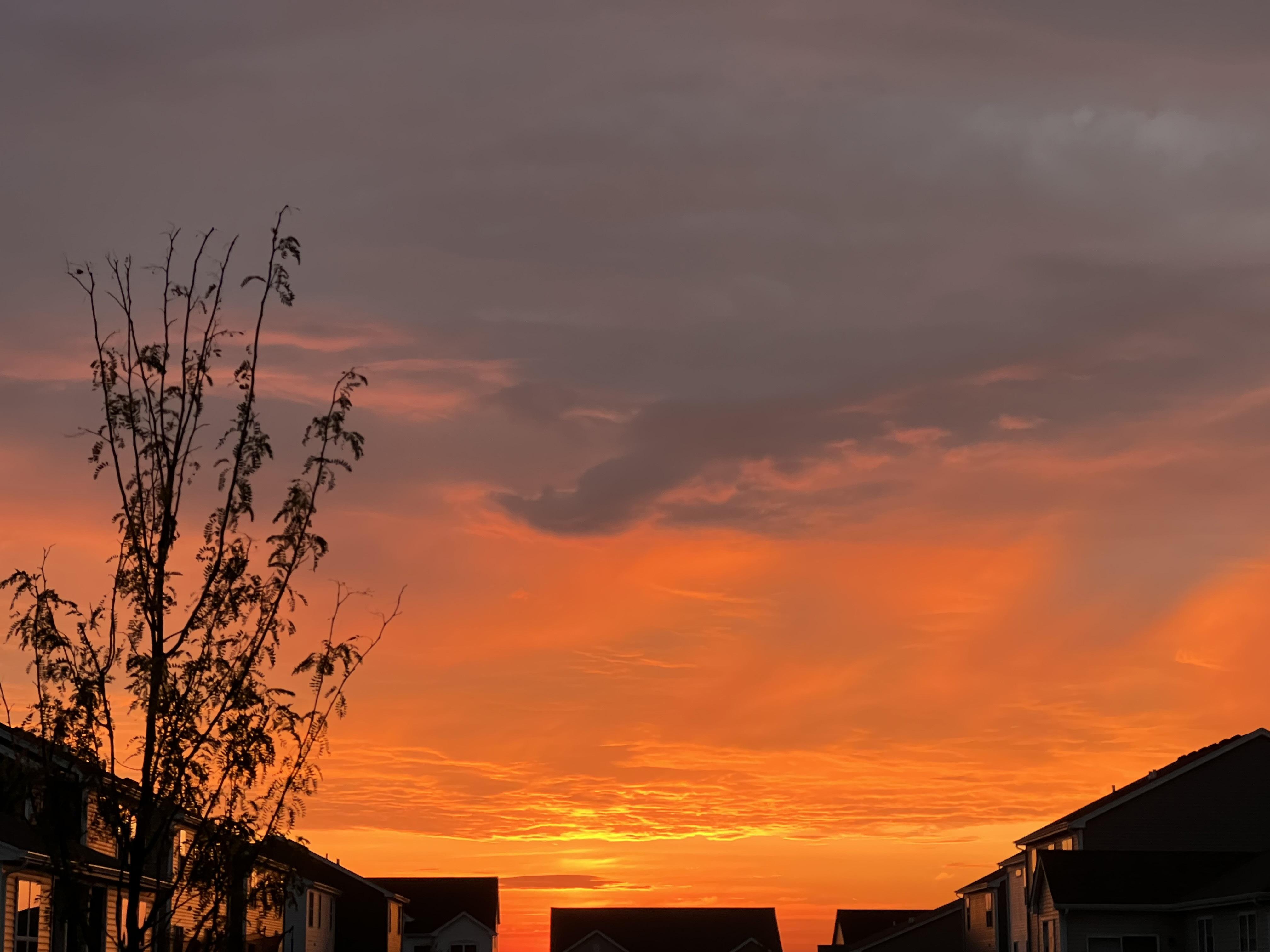 “Catching Sunrise in Elburn, IL: A fiery orange sky spills over quiet rooftops as dawn breaks.”