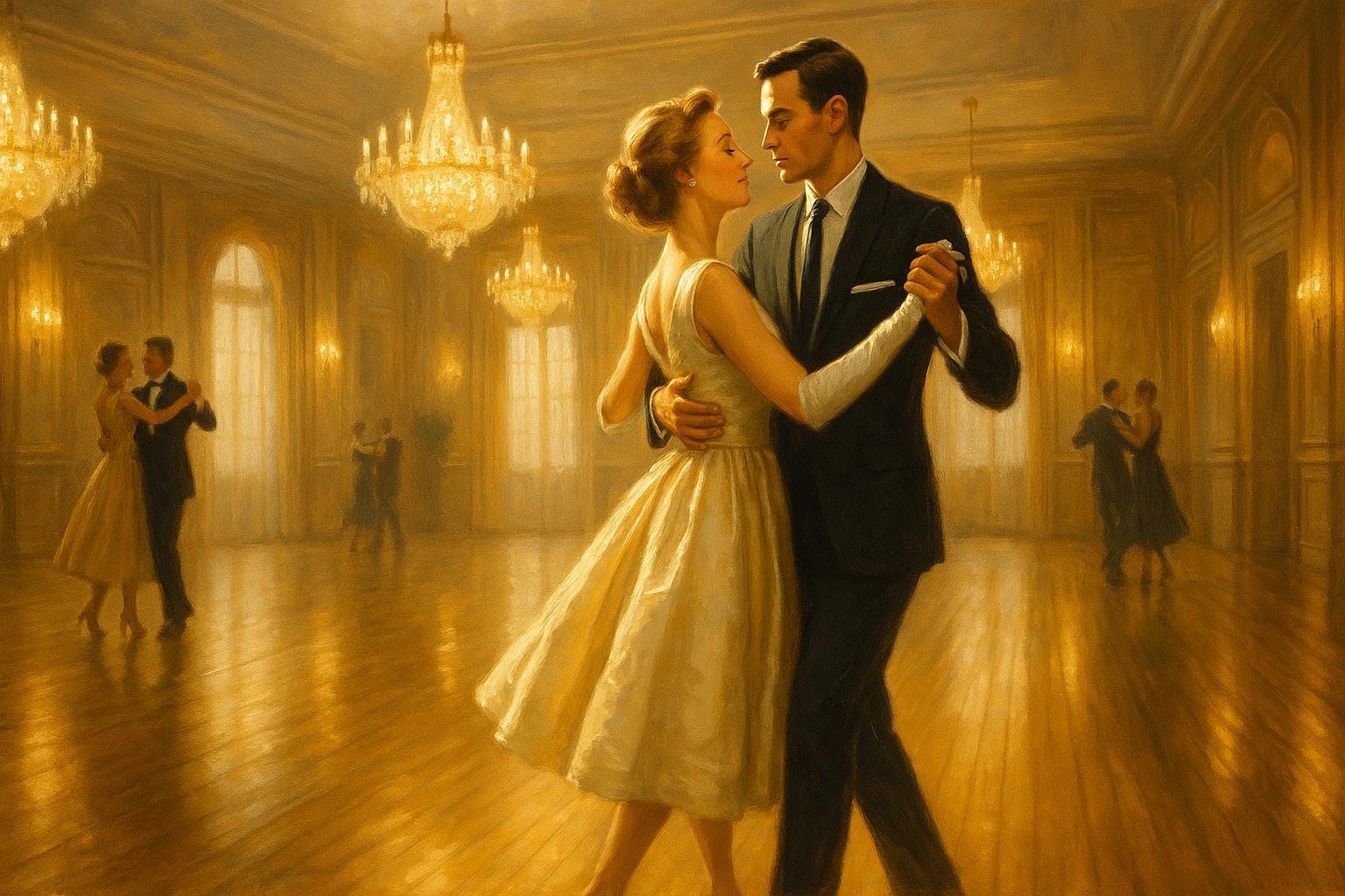 “1960s couple waltzing beneath chandeliers in a luminous, elegant ballroom.”