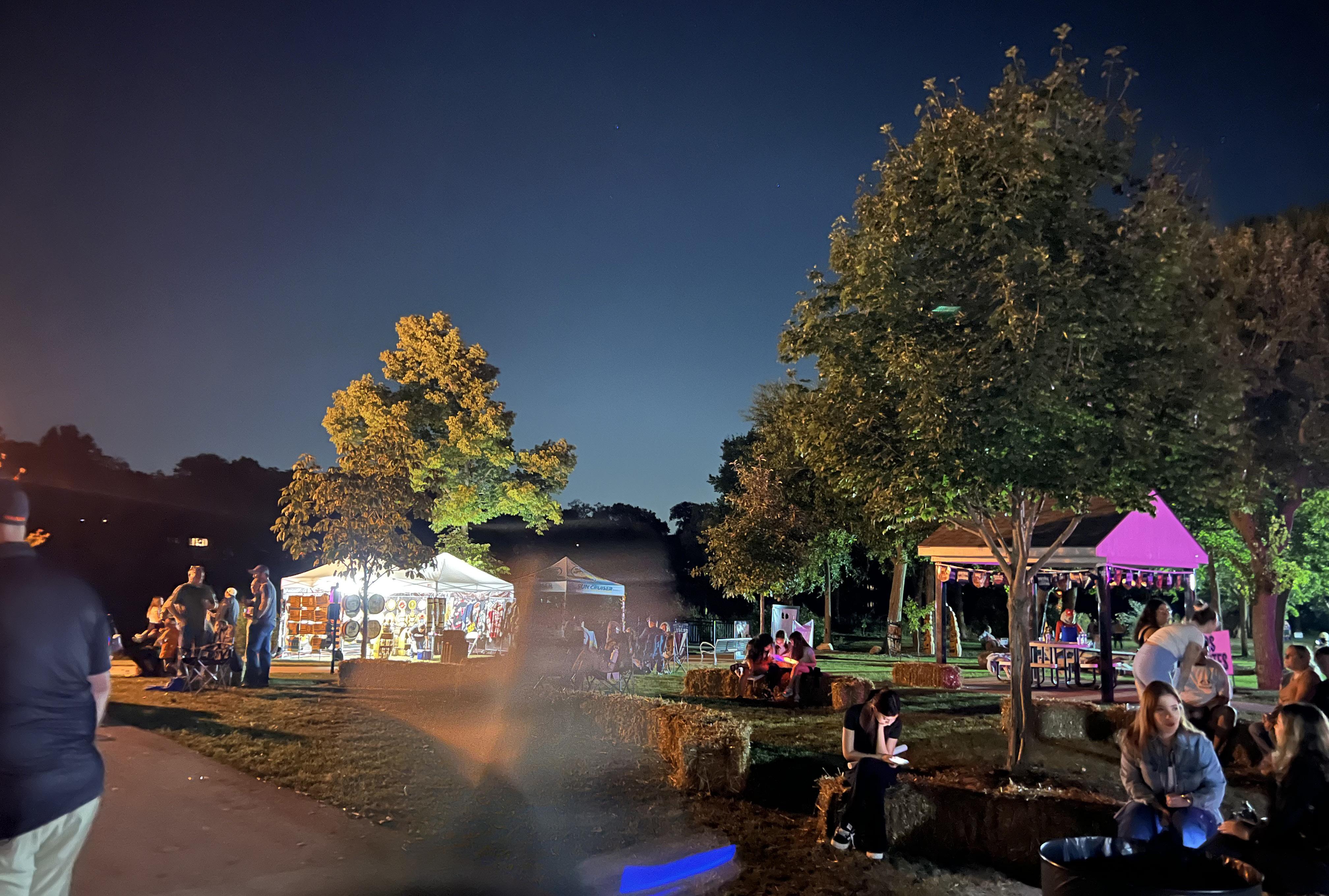 Centennial Park aglow at Yorktoberfest: families on hay bales, music and booths lighting a crisp Fox Valley night in Yorkville.