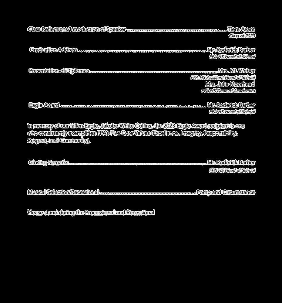 Parents, I’d also like to congratulate you on this momentous occasion. Everyone attending the commencement ceremony shares the same goal - to celebrate their child, student, relative, teacher, and friend. This is why we ask that when celebrating your loved one, you remain mindful of those around you who are also waiting to hear their graduate’s name and see them receive their high school diploma. With everyone’s community and respect towards all present, we know we will have a great graduation ceremony.