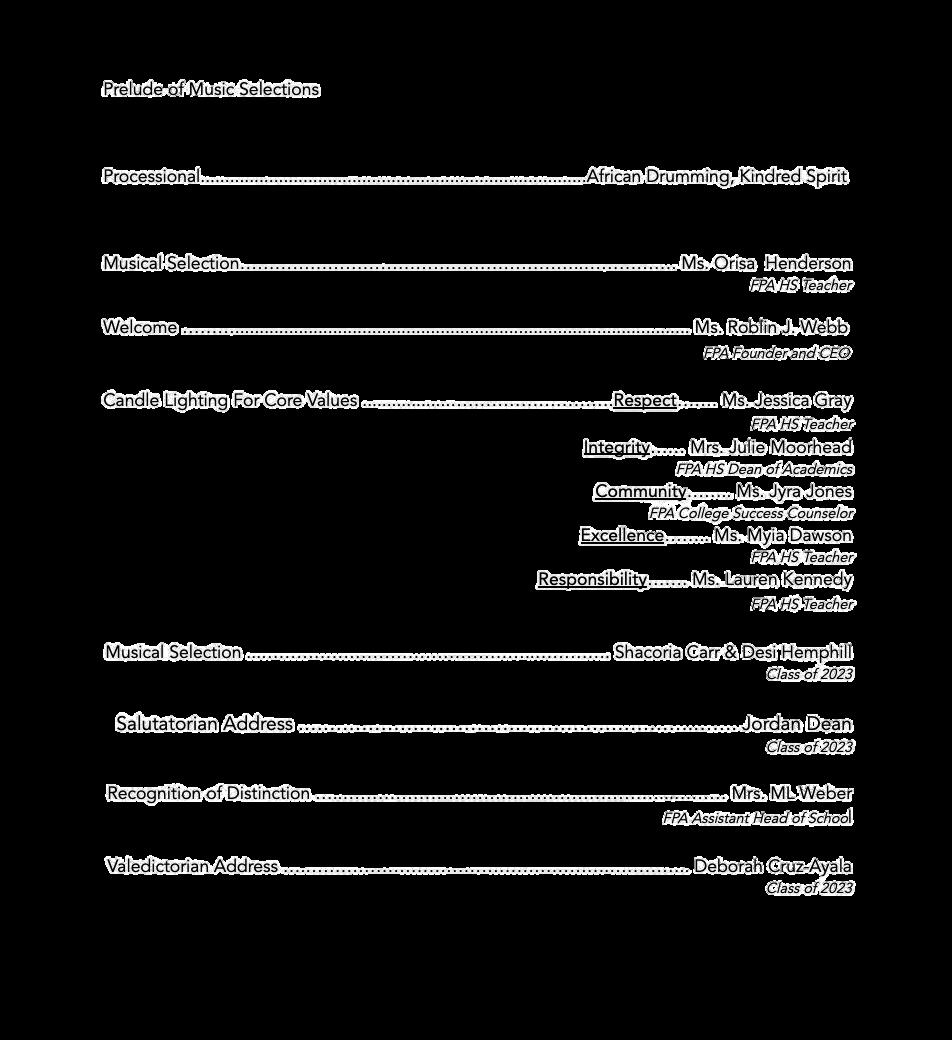 Along with your teachers, families, and friends, I would like to congratulate you on being a member of Freedom Preparatory Academy’s Class of 2023! Because of your perseverance and dedication, you will be accepting your high school diploma. As you embark on a new journey, the same hard work and dedication will help you make your dreams become a reality.