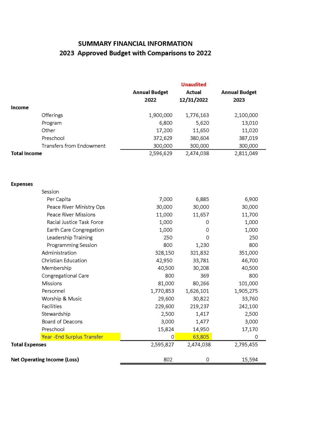 What an exciting year 2022 was at FPCN! Thanks to such a loving, faithful, and generous congregation we had another great year both spiritually and financially. We ended the year in the black with $63,805 in revenue over expenses. The Finance Committee and Session agreed that the best way to steward this surplus was to transfer it to a TR Session Reserve account until we could determine the best use for it.