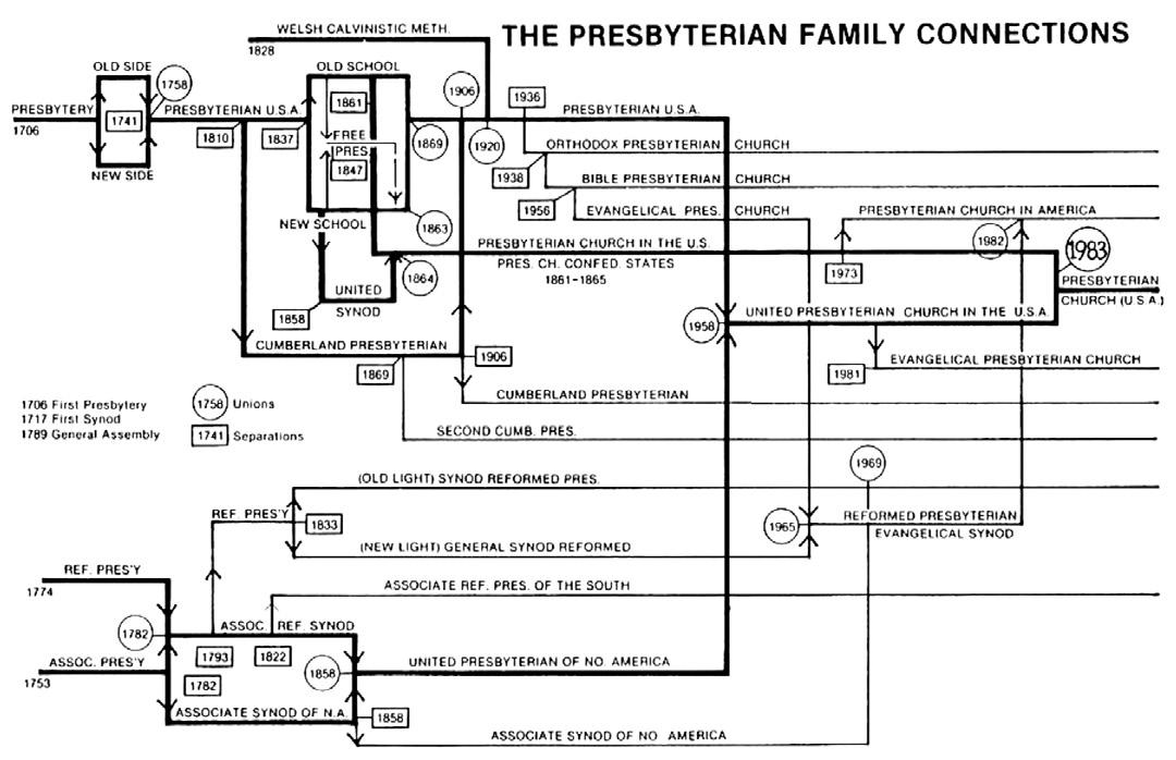 As we work through difficult denominational issues facing First Pres, we might benefit by looking at our church affiliation through the lens of history. A visit to the Presbyterian Historical Society Archives website shows our Presbyterian denominational family tree. You can see from the diagram how the Presbyterian Church has taken many twists and turns from as far back as 1706, and continuing for the next 300 years.