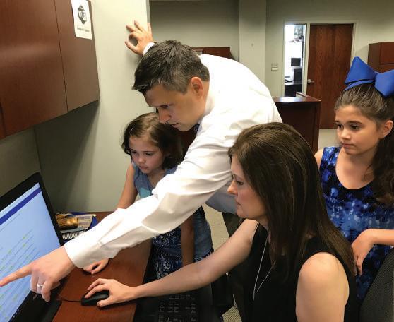 At right: Julie Walthall searches through the names of Walthalls in the database, while Walter and their two daughters Abigail and Grace look on. Walter points out the name of his grandfather's brother, Frank Paschal Walthall.
