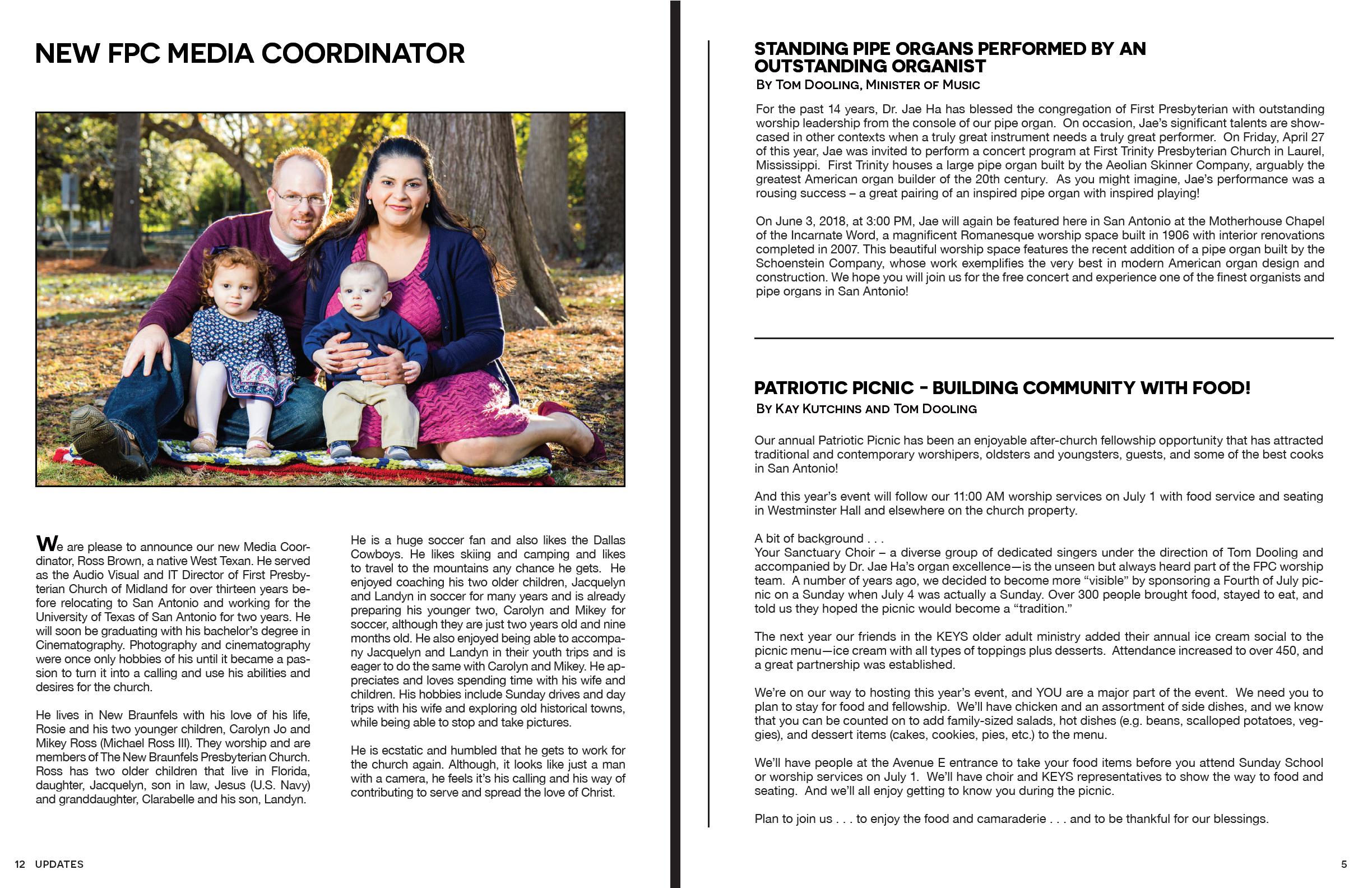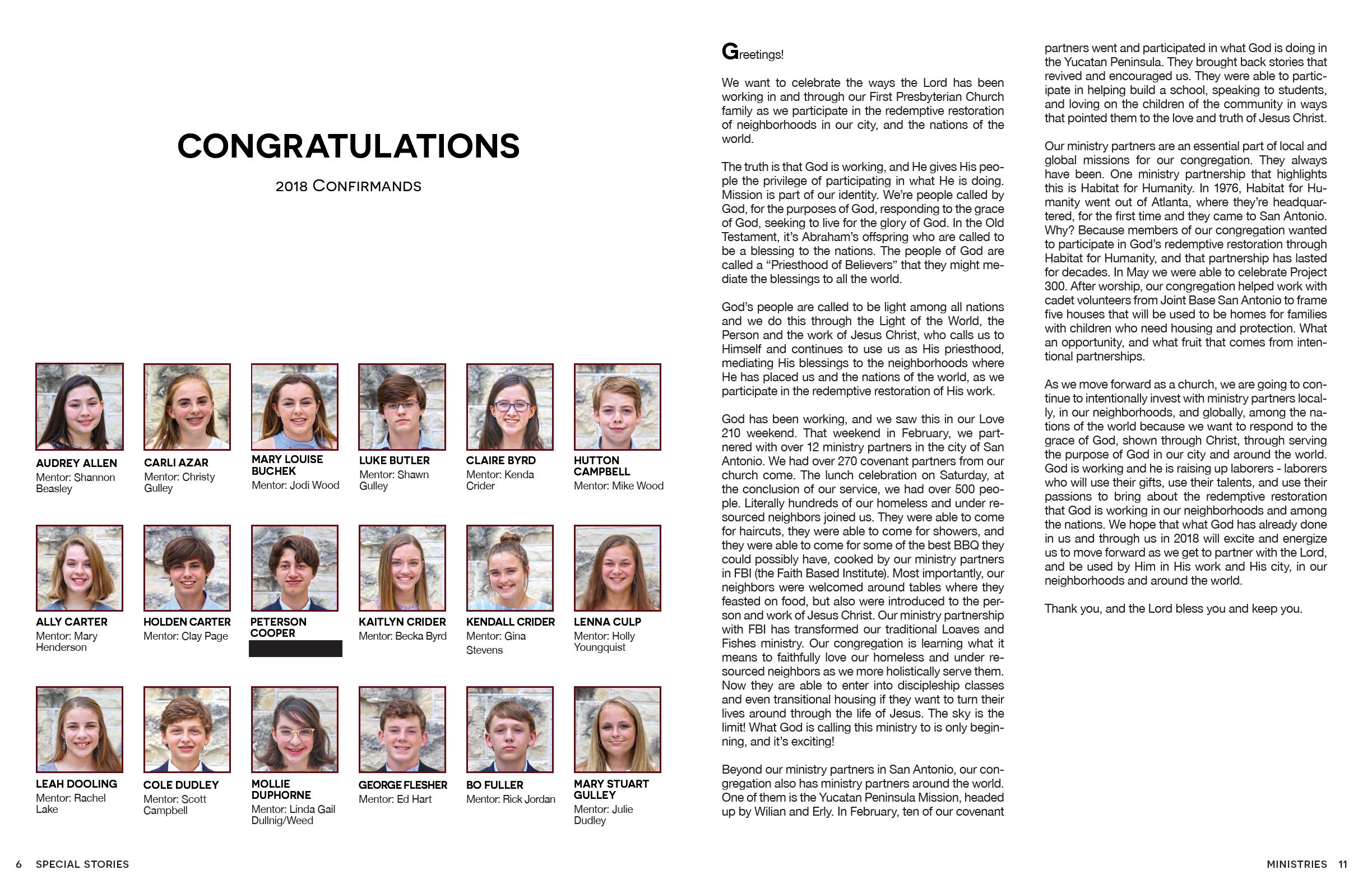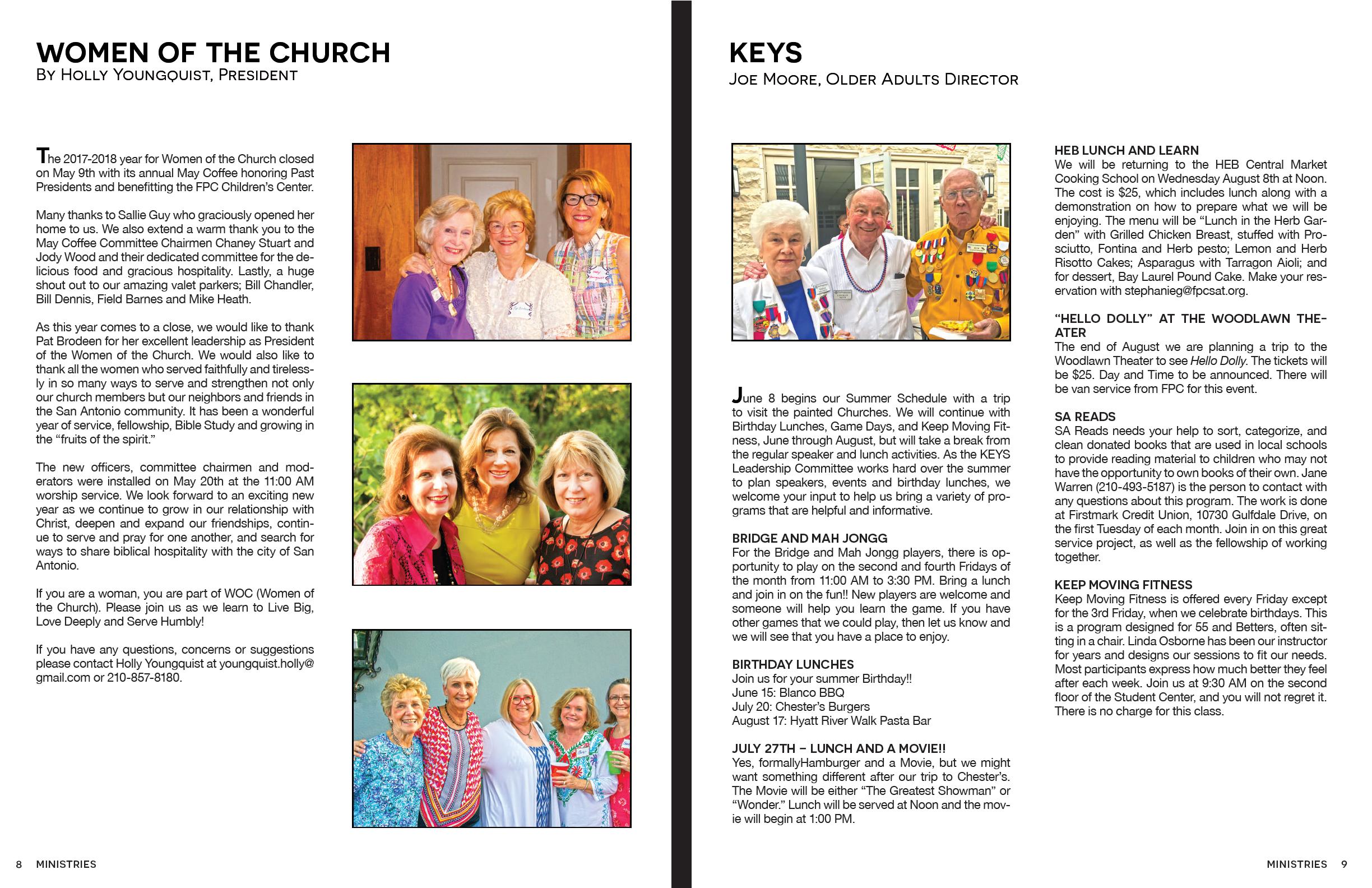 FPC is teaming up with Lifetouch Church Directories for a new 2018 Pictorial Directory! Don’t miss this chance to be a visible part of our FPC family! Portrait sessions are taking place June 1-June 3, and June 13-17. To make your appointment online, visit www.fpcsanantonio.org/pictorial-directory. A sign-up table is also be available Sundays. We are in need of volunteers for greeting and registration. Please contact Stephanie Garcia at (210) 226-0215/stephanieg@fpcsat.org.