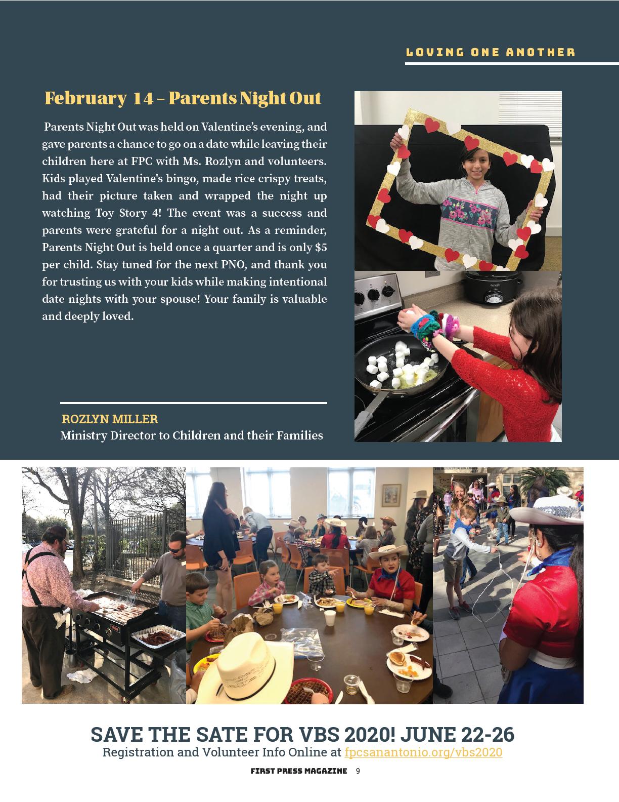 Want to volunteer for VBS? Please contact Rozlyn Miller at rozlynm@ fpcsat.org. Key volunteer positions currently needed: Bible Class Teachers. Early registration for kids 4 years - 5th grade begins March 2 at fpcsanantonio.org/vbs2020