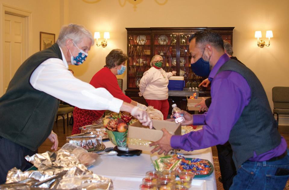 Page 20 top photo: WOC provides Christmas Eve dinner to officers helping with security for services. Page 21 left photo: Singers, musicians, and staff also enjoyed the Christmas eve spread provided by WOC. Page 21 right photo: WOC delivers Christmas gift bags to Morningside Manor.