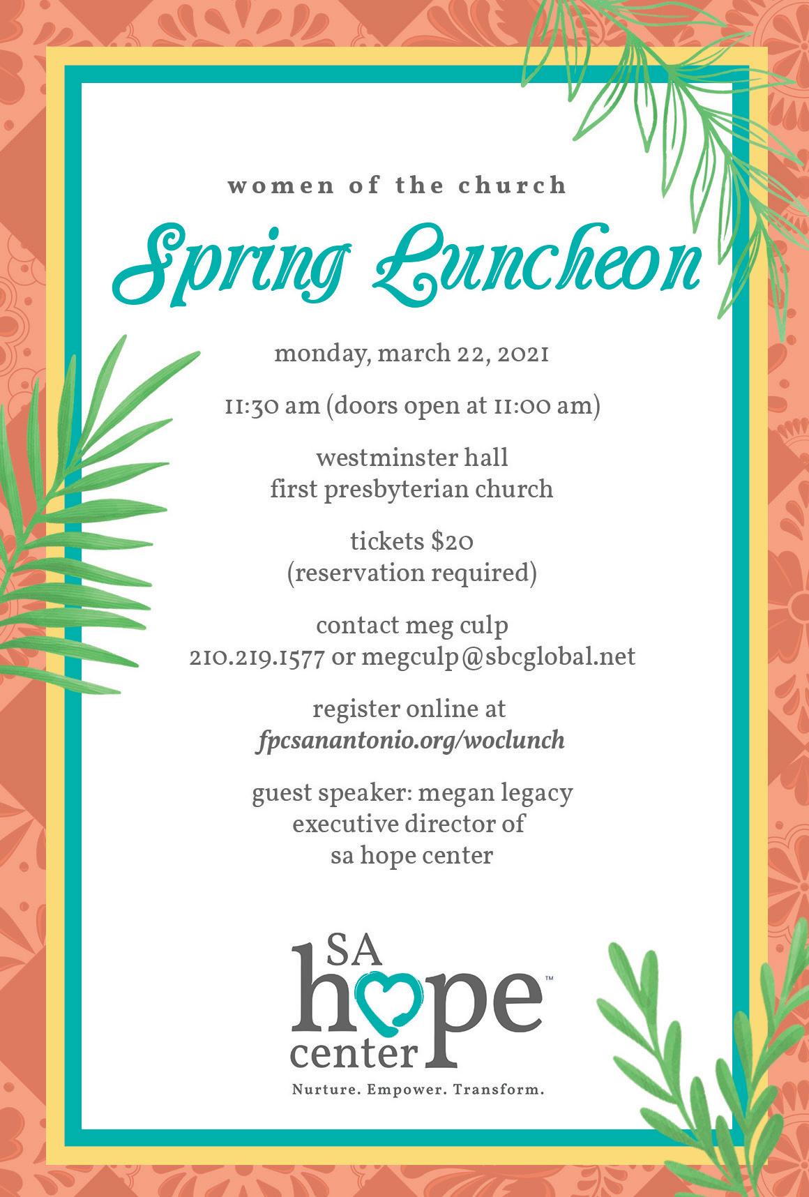Our guest speaker is Megan Legacy, executive director of SA Hope Center. $20/person. Register inperson at the table outside the Ave. E entrance on Sundays (February 28, March 7, & March 14) or online at fpcsanantonio.org/woclunch. Checks & cards accepted. Contact Meg Culp at megculp@sbcglobal.net or 210219-1577. Our guest speaker will be streamed FREE online at 12:00 PM at fpcsanantonio.org/event-video