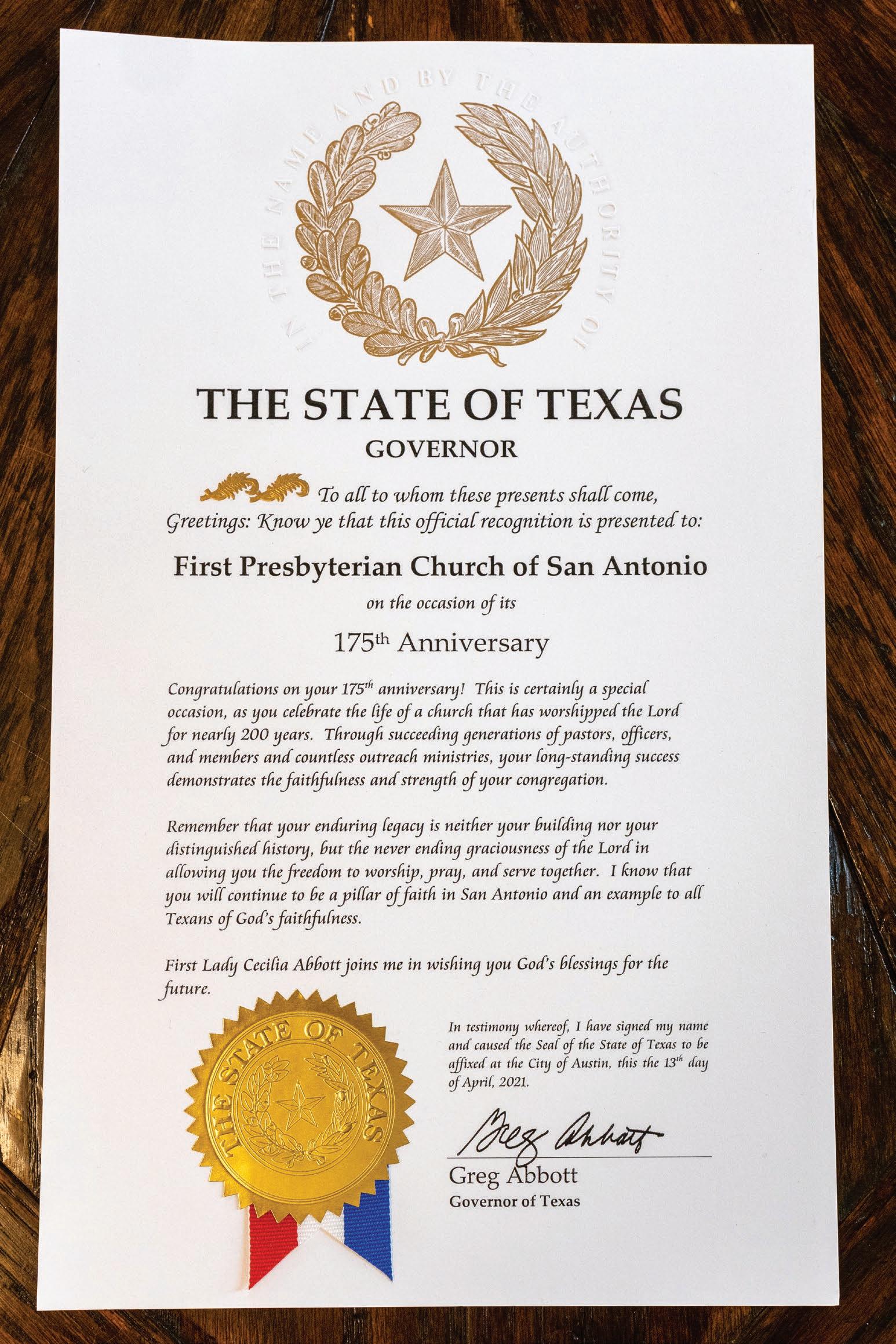 Nevertheless, over the last 175 years First Presbyterian Church has been recognized as a vital influence and holy presence in San Antonio, Texas, and beyond. Last week, I was humbled to receive the following proclamation from Governor Greg Abbott.