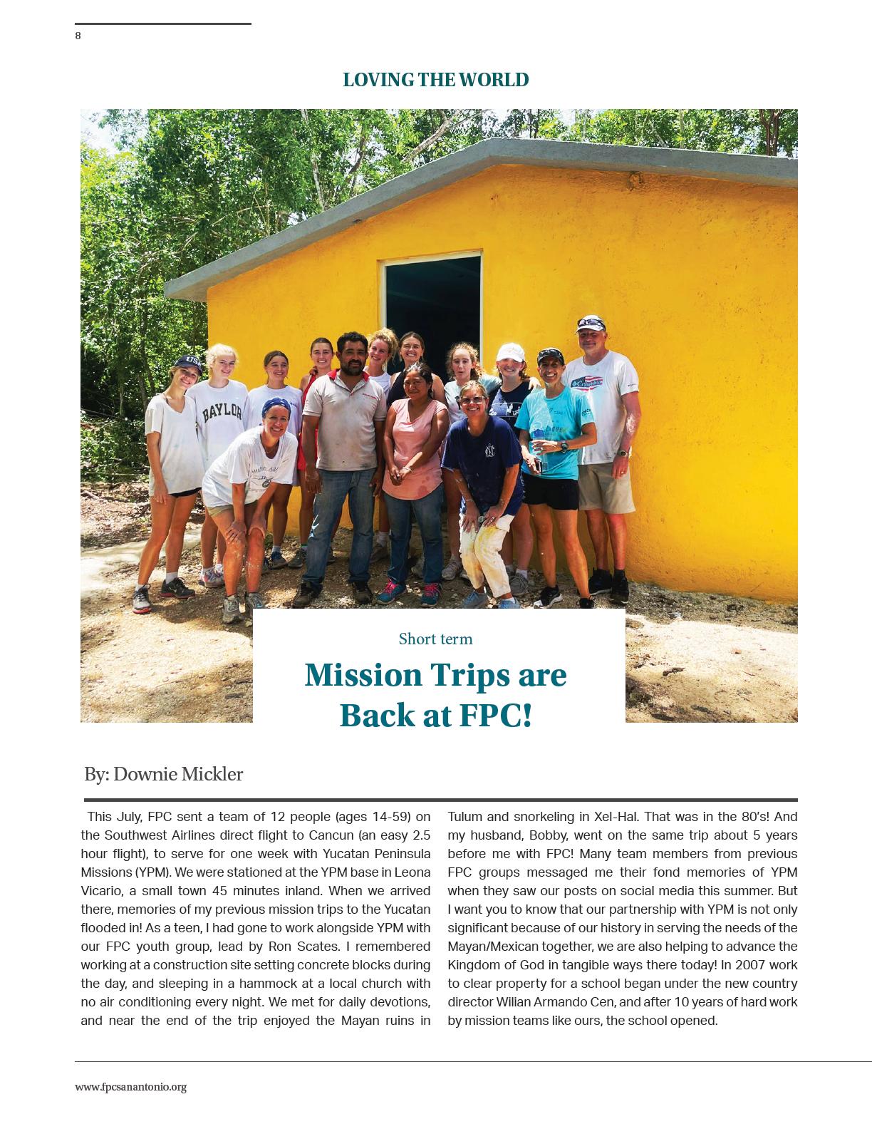Pray for new teams to form and prepare for the short trip that will change lives. God wants us to participate. Please pray for and/ or go on a short term mission trip this coming year if you feel the Spirit’s tug. Contact Lindsay Sell at lindsays@fpcsat.org for more information. May God bless our participation in His global mission.
