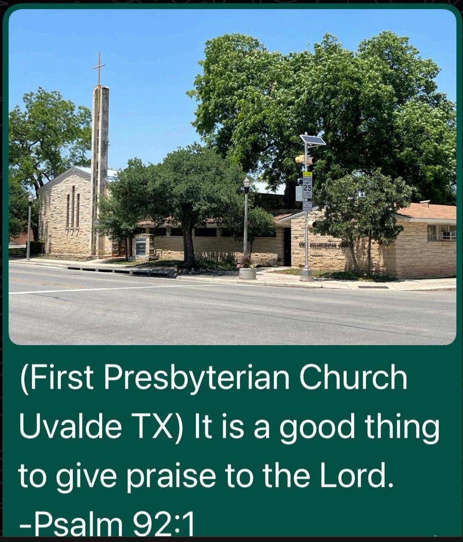 By 2 p.m it was 100 degrees! I had another mission: finding the house of one of our Sunday School teachers Paul Kacsur, who lived there before answering the call to ministry some 40 years ago. Eureka! I found it in 13 minutes. Then, First Presbyterian Church in Uvalde, where I said a prayer. Last stop: Garner Field, Hangar 6… The nearby Aviation Museum and Uvalde Police Department parking lots were full of Police cars from all over Texas. On the way back to San Antonio, I praised the Lord for another opportunity to serve.