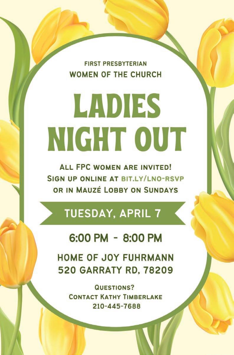 LADIES NIGHT OUT: Tues, Apr 7, 6:00 PM–8:00 PM, home of Joy Fuhrmann. Women of all ages are invited to a Ladies Night Out. Come enjoy an evening of fellowship and connection. Guests are invited to bring an appetizer, dessert, or bottle of wine to share. Please RSVP at http://bit.ly/lno-rsvp. Contact Kathy Timberlake for more information, kathytimberlake316@gmail.com