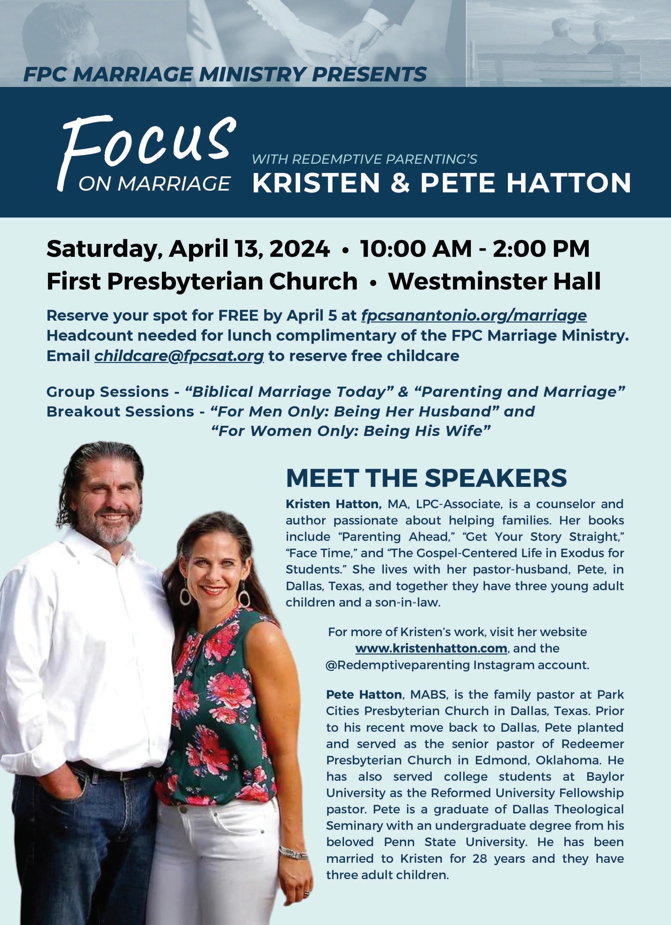 Description: Event focused on marriage with Kristen and Pete Hatton. Kristen is a Christian counselor, writer, and speaker, while Pete is the Family Minister at Park Cities Presbyterian Church. They will share their wisdom and ignite excitement in our marriages, covering topics such as Christian marriage today and the intersection of parenting and marriage. RSVP for lunch at fpcsanantonio.org/focus-on-marriage. Email childcare@ fpcsat.org to reserve free childcare for the event (please pack a lunch for children). See more information on page 22