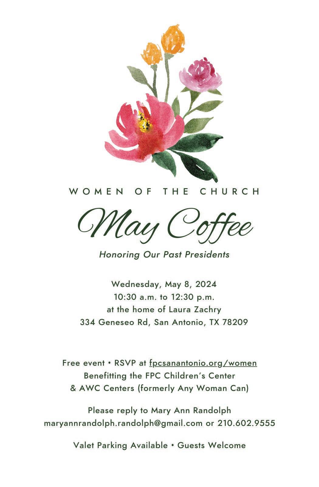 3 www.fpcsanantonio.org April 2024 CONTENTS SAVE THE DATE 4-7 Concerts, Fiesta, and More: April & May Events and "At-A-Glance" List of Additional Important Dates MINISTRY ARTICLES 8 Missions Ministry & Serve Opportunities 9 April Concerts at FPC 10 Flowers at First - A Beautiful Way to Glorify God and Honor/Memorialize Loved Ones 11 National Day of Prayer & Prayer Walk 12-17 Looking Back - Looking Ahead: 2023 Year-End Celebration Report 18-21 2024 Easter Lilies: Honoring & Memorializing our Loved Ones 22 Focus on Marriage with Guest Speakers from Redemptive Parenting 23-27 Women of the Church April: Circles Schedule Invitations to April & May WOC Events, WOC President's Letter, & Photo Collection 28-29 KEYS Older Adult Ministry April FIRST CUP 30-31 Readings and Prayer List BACK COVER 32 New Babies at FPC!