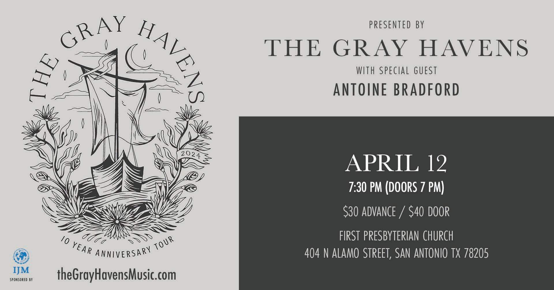 Join us at FPC for The Gray Havens 10-Year Anniversary Tour featuring Antoine Bradford, sponsored by the International Justice Mission. Visit bit.ly/gray-havensfpcsatx24 for $30 advance tickets, $40 at the door. VIP packages available for purchase separately. For more information about IJM, visit www.ijm.org.