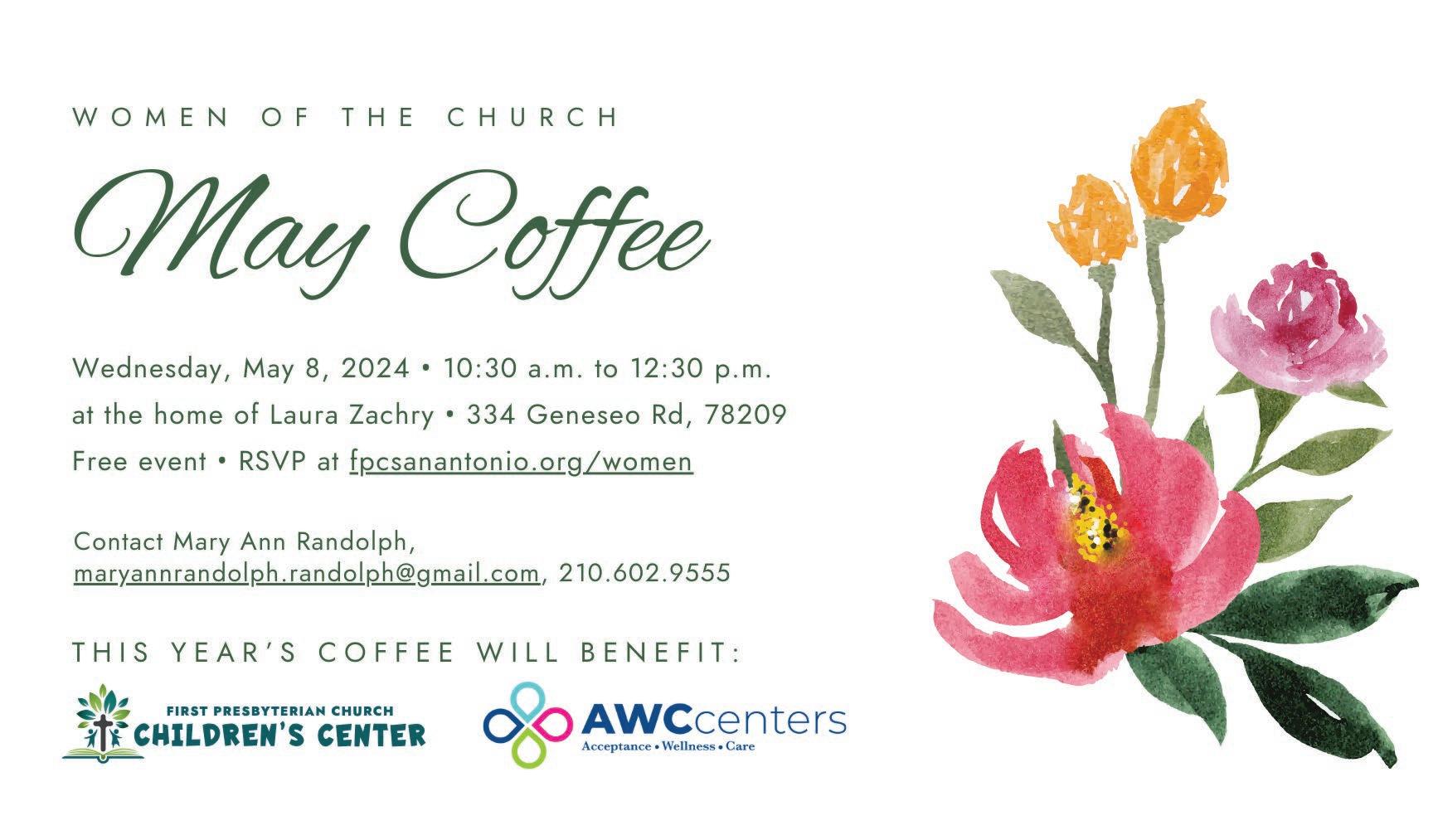 Next on the calendar is the annual Women of the Church May Coffee to be held on Wednesday, May 8 from 10:30 AM to 12:30 PM. Laura Zachry will be hosting us in her lovely home at 334 Geneseo Road for our final event of the year. All women of First Presbyterian Church are invited and guests are welcome so bring a friend. It will be a joyous occasion as we honor our Past Presidents and another year filled with service projects, treasured friendships and many blessings. The beneficiaries for this year’s offering include the FPC Children’s Center Teacher Scholarship Fund and the AWC Centers (formerly Any Women Can). This is always a wonderful morning and convenient for those during their lunch hour. Valet parking is available. We thank the Coffee Committee of Townsend Durbin, Karen Heydenreich and Mary Ann Randolph for planning this event.