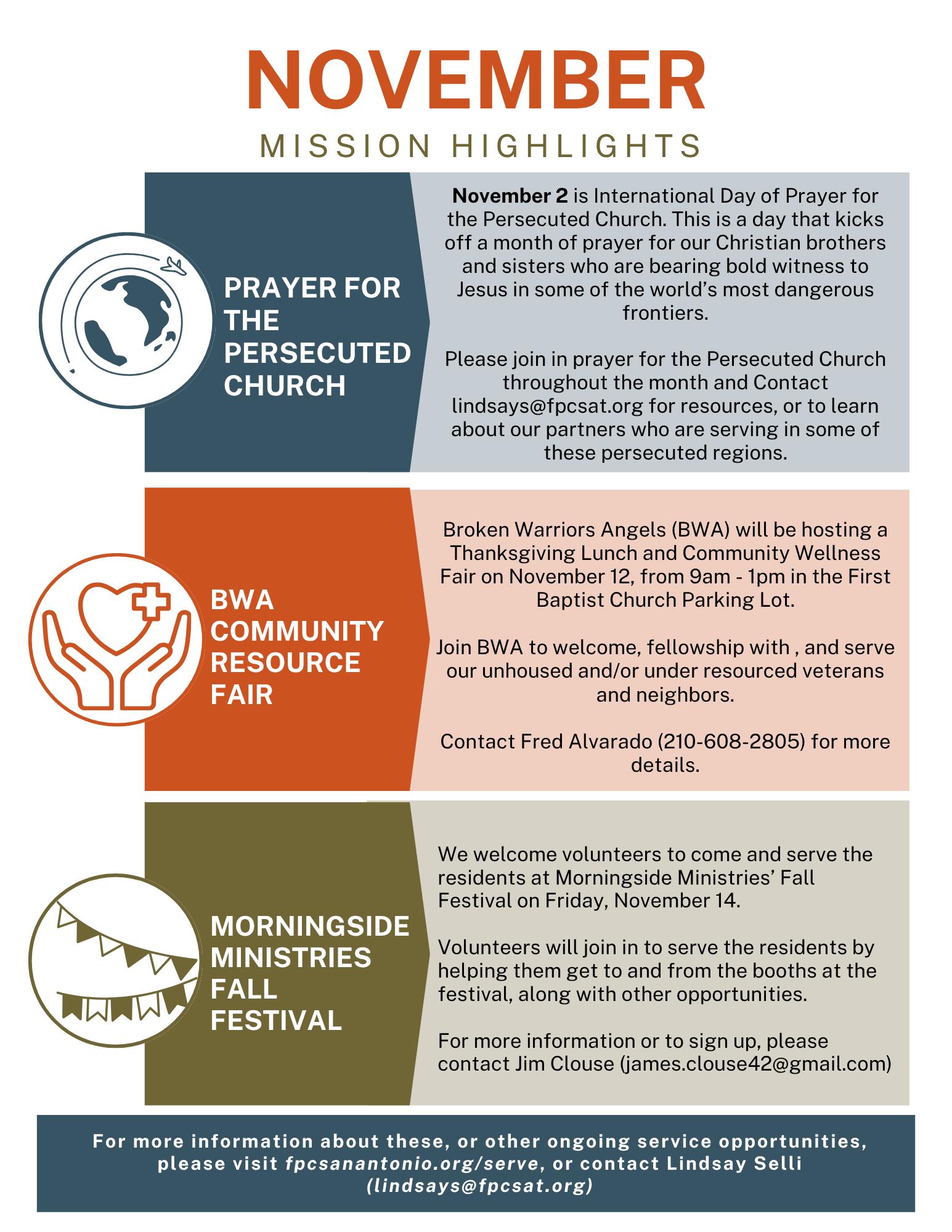 THANKSGIVING LUNCH & WELLNESS FAIR: 9:00 AM–1:00 PM, First Baptist Church Parking Lot. Serve and fellowship with unhoused and under-resourced veterans. Contact: Fred Alvarado, 210608-2805.