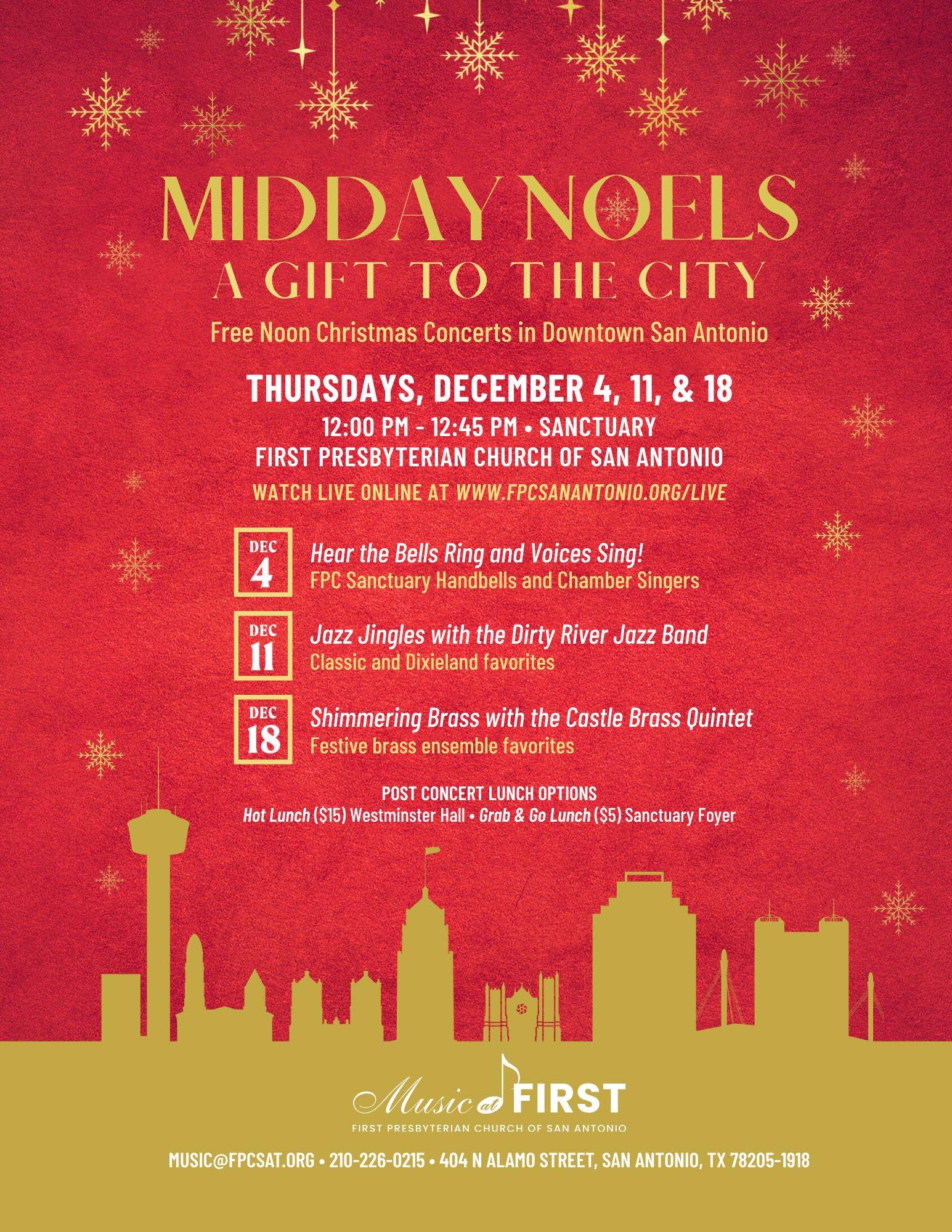 MIDDAY NOELS CONCERT – JAZZ JINGLES WITH THE DIRTY RIVER JAZZ BAND 12:00–12:45 PM, Sanctuary. Second concert in the free Midday Noels series.