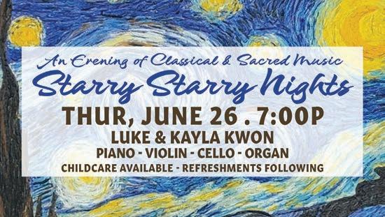 Join us Thursday, June 26 at 7:00pm in our church sanctuary for an evening of incredible music as we welcome back the Kwon Family. Luke and Kayla Kwon on piano, violin, cello, and organ. This will surely be a fantastic evening!