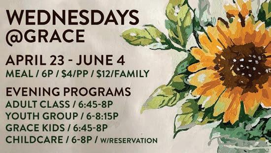 Tue, April 22 Weds@Grace Dinner & Class Kick Off 6:00pm / 6:45pm Gym / Classrooms