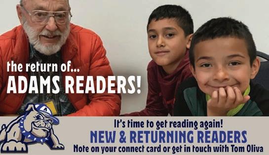 Estamos buscando personas para dedicar una hora a la semana a la Escuela Adams en un programa de lectura. La lectura es sólo una parte. Quizás aún más importante sea construir una relación y alentar a los estudiantes en sus esfuerzos. Lo importante en todos los programas de mentoría es animar al aprendiz, afirmar su valor y ser consistente en las reuniones. Mientras tanto, ¡puedes ayudar a un estudiante con habilidades esenciales en lectura! Para obtener más detalles, comuníquese con Tom Oliva, 509-571-4543.