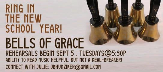Ring in the new (school) year by trying Bells of Grace. No bell experience necessary. Ability to read music helpful, but not a deal breaker. Recommended ages: 12-100. Try a few sessions to see what the excitement is all about. We will meet Tuesdays starting September 5th at 5:30 pm in the Mid-Hi Room. Questions? Contact Julie Hunziker: (530)209-4329 or jbhunziker@gmail.com
